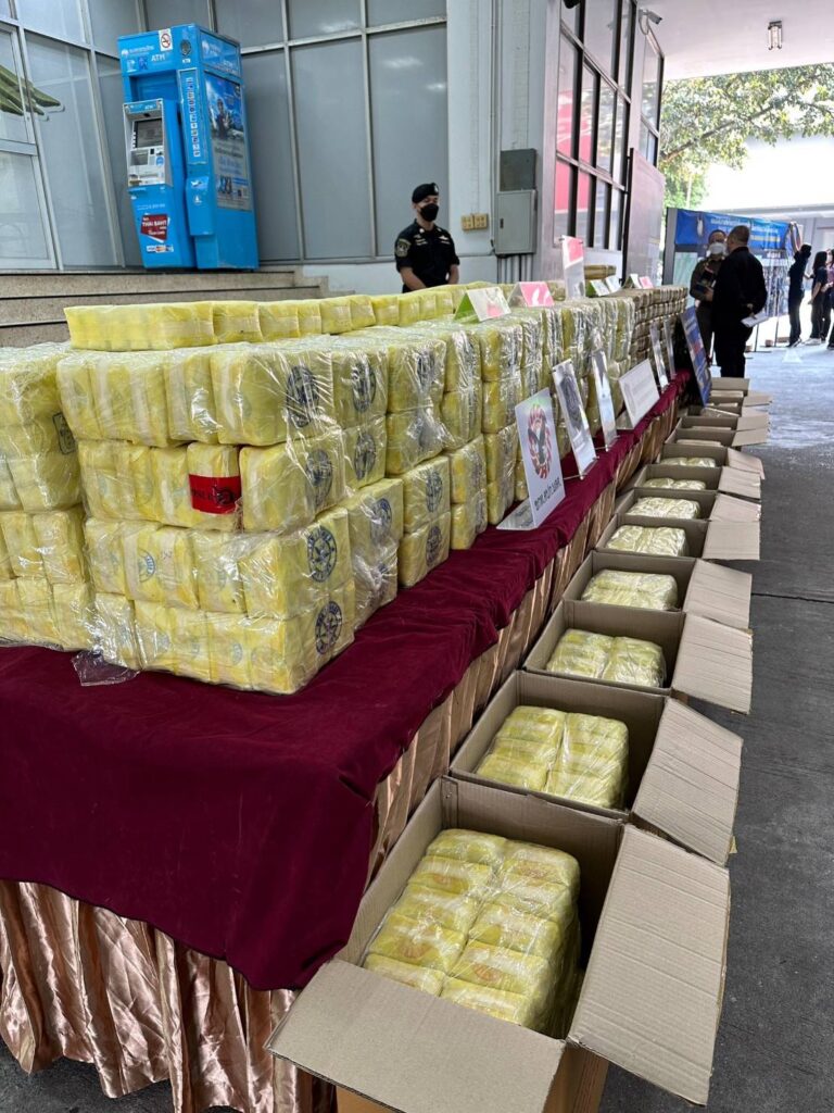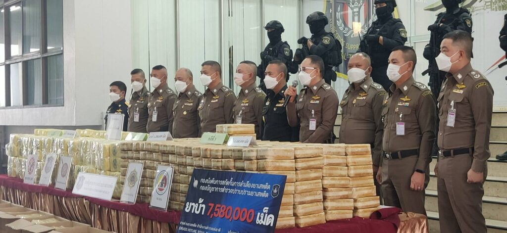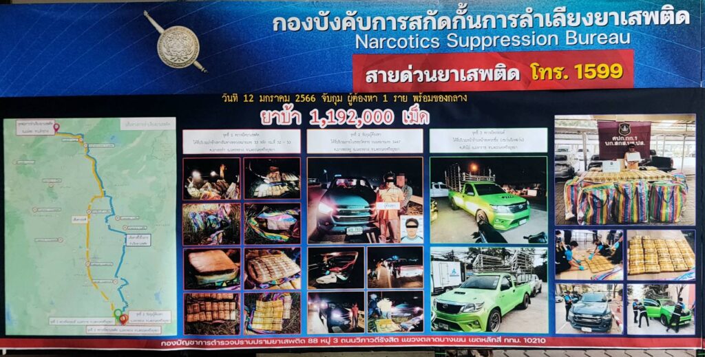 คดีที่ 2 เจ้าหน้าที่ตำรวจ บก.สกส.และ บก.ขส. ได้ร่วมกันทำการจับกุมตัว นายมานพ (สงวนนามสกุล) ภูมิลำเนา ต.รวมไทยพัฒนา อ.พบพระ จ.ตาก ได้บริเวณป่าข้างทางริมถนนหมายเลข 33 หลัก กม.ที่ 52-53 ต.บางระกำ อ.นครหลวง จว.พระนครศรีอยุธยา สืบเนื่องจากได้รับแจ้งจากสายลับว่านายมานพฯ กับพวก มีพฤติการณ์ ร่วมกันลำเลียงยาเสพติด จากพื้นที่ทางภาคเหนือ ไปส่งมอบให้กับลูกค้า ในพื้นที่ภาคกลางและปริมณฑล และพื้นที่ใกล้เคียง ซึ่งในวันที่ 10-13 ม.ค.66 จะใช้รถยนต์บรรทุกส่วนบุคคล ยี่ห้อ ISUZU รุ่น D-MAX สีเทา หมายเลขทะเบียน ผข 76XX พิษณุโลก และรถยนต์บรรทุก TOYOTA สีเขียว หมายเลขทะเบียน 1ฒท 82XX กรุงเทพมหานคร และรถยนต์ TOYOTA สีดำ หมายเลขทะเบียน ขร 92XX เชียงใหม่ เป็นยานพาหนะที่จะใช้ในการนำทาง,สำรวจด่านตรวจ และลำเลียงยาเสพติดจำนวนมากจากพื้นที่ทางภาคเหนือ ไปส่งมอบให้กับลูกค้าในพื้นที่ภาคกลางและปริมณฑล และพื้นที่ใกล้เคียง เจ้าหน้าที่จึงระดมกำลังสกัดกั้นตลอดเส้นทาง ถนนสายหลัก ถนนสายรอง และเส้นทางเชื่อมต่อที่คาดว่ากลุ่มบุคคลดังกล่าวจะใช้เป็นเส้นทางในการลำเลียงยาเสพติด ในเขตพื้นที่ จว.นครสวรรค์, ชัยนาท,สิงห์บุรี,อ่างทอง, ลพบุรี,สระบุรี,พระนครศรีอยุธยา กระทั่งเวลา 21.30 น. ของวันที่ 12 ม.ค.66 สามารถสกัดกั้นรถยนต์เป้าหมายทั้ง 3 คัน ไว้ได้ หลังพบวิ่งตามถนนเลียบคลองชลประทาน ทิศทางมุ่งหน้า อ.บางปะหัน จ.พระนครศรีอยุธยา แต่ระหว่างตรวจค้นจับกุม ผู้ขับขี่ รถยนต์ TOYOTA สีดำ หมายเลขทะเบียน ขร 92XX เชียงใหม่ ได้อาศัยจังหวะเร่งเครื่องยนต์ขับหลบหนีไปได้ เบื้องต้น ตรวจยึดยาบ้า 604 มัด รวมจำนวน 1,208,000 เม็ด และ ยึดรถกระบะ หมายเลขทะเบียน ผข 76XX พิษณุโลก (ใช้ขับนำทาง/สำรวจด่านตรวจ),รถบรรทุก หมายเลขทะเบียน 1ฒท 8296 กรุงเทพมหานคร (ยึดได้ที่หน้าร้านหน้าสะดวกซื้อ ต.หัวไผ่ อ.มหาราช จ.พระนครศรีอยุธยา ผู้ต้องหาหลบหนี),โทรศัพท์มือถือ 2 เครื่อง พร้อมแจ้งข้อหา “จำหน่ายยาเสพติดให้โทษประเภท 1 (เมทแอมเฟตามีนหรือยาบ้า) โดยผิดกฎหมาย อันเป็นการกระทำให้เกิดผลกระทบต่อความมั่นคงของรัฐ หรือความปลอดภัยของประชาชนทั่วไป และก่อให้เกิดการแพร่กระจายในกลุ่มประชาชน”