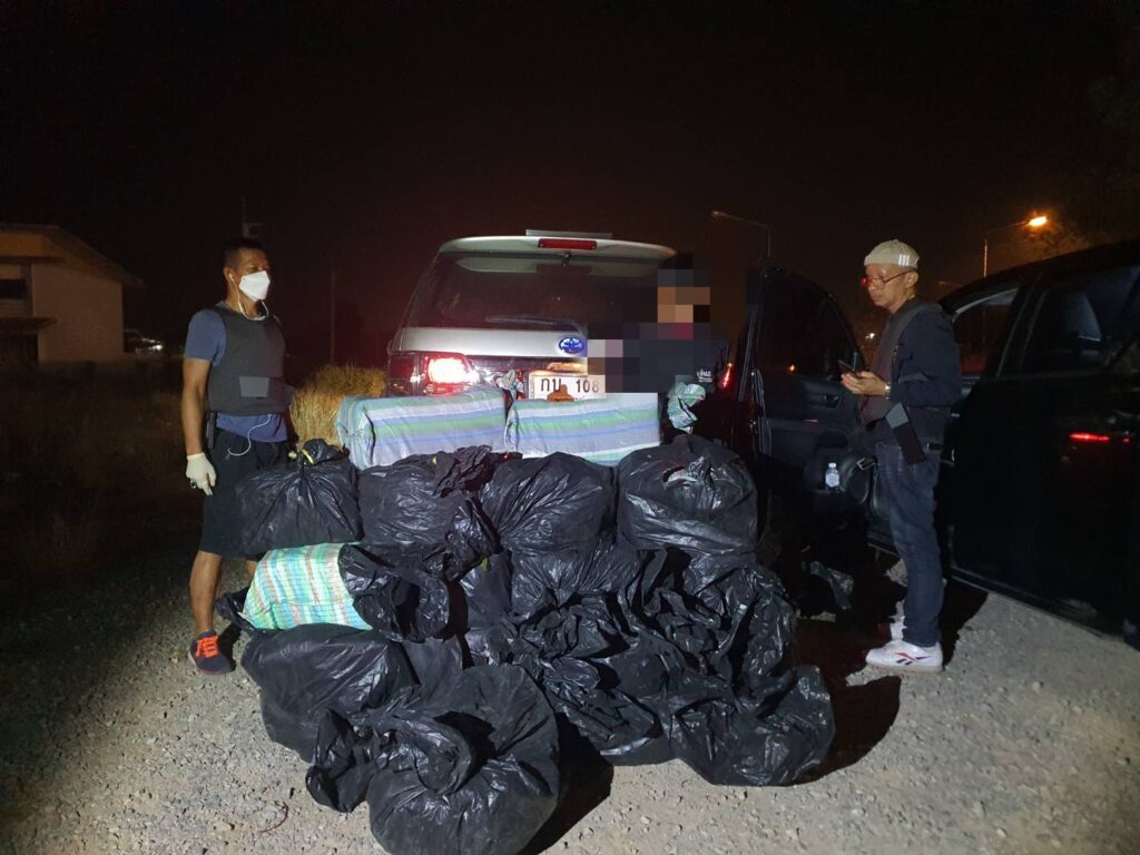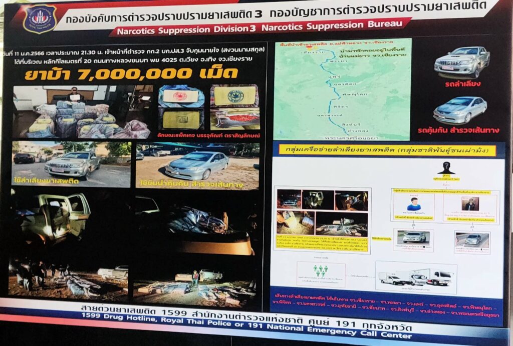 คดีแรก เจ้าหน้าที่ตำรวจ กก.2 บก.ปส.3 บูรณาการร่วมกับหน่วยที่เกี่ยวข้อง จับกุมนายใจ (สงวนนามสกุล) อายุ 45 ปี ได้บริเวณริมถนนทางหลวงชนบท หลักกิโลเมตรที่ 20 ต.เวียง อ.เทิง จ.เชียงราย ซึ่งก่อนจับกุมเจ้าหน้าที่ตำรวจ กก.2 บก.ปส.3 ได้รับแจ้งว่าเครือข่ายยาเสพติดกลุ่มชาติพันธุ์ม้ง กับพวก มีพฤติการณ์ลำเลียงยาเสพติดจากพื้นที่ อ.เมืองเชียงราย เพื่อนำไปพักคอยในพื้นที่ อ.เทิง จว.เชียงราย ก่อนที่จะส่งต่อให้กับกลุ่มลำเลียงยาเสพติดเข้าสู่พื้นที่ตอนในของประเทศ โดยใช้รถยนต์เก๋ง ยี่ห้อ ฮอนด้า ทะเบียน กพ 71X เชียงราย ซึ่งช่วงเช้าวันที่ 11 ม.ค.66 เจ้าหน้าที่ชุดสืบสวนจึงได้เฝ้าติดตามจนได้พบรถยนต์ที่ได้รับแจ้งจริง และพบรถยนต์กระบะ ยี่ห้อ โตโยต้า ทะเบียน บธ 78XX พะเยา ขับนำ รถยนต์กระบะ ยี่ห้อ โตโยต้า รุ่นวีโก้ สีเทา หมายเลขทะเบียน บน 98XX พะเยา (คนขับหลบหนี) และ รถยนต์กระบะยี่ห้ออีซูซุ ทะเบียน บน 31XX พะเยา (หลบหนี)