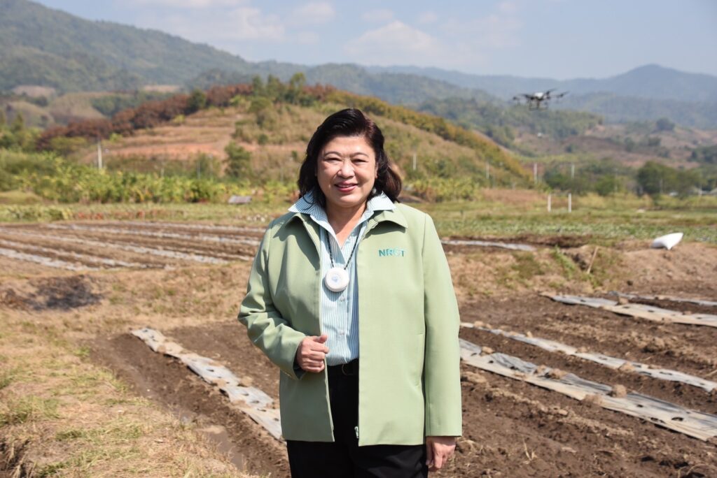 สำหรับโครงการถ่ายทอดเทคโนโลยีโดรนระบบอัตโนมัติเพื่อประยุกต์ใช้งานการพัฒนาพื้นที่สูง (การสำรวจ การเกษตร และการป้องกันอุบัติภัย) (วช.) ได้สนับสนุนทุนให้กับสมาคมกีฬาเครื่องบินจำลองและวิทยุบังคับ ในการดำเนินโครงการฯ โดยคณะผู้วิจัยได้ถ่ายทอดเทคโนโลยีโดรนระบบอัตโนมัติเพื่อประยุกต์ใช้งานการพัฒนาพื้นที่สูง แก่เจ้าหน้าที่มูลนิธิแม่ฟ้าหลวงในพระบรมราชูปถัมภ์ และชาวบ้านในพื้นที่โครงการร้อยใจรักษ์ โดยนำอากาศยานไร้คนขับแบบหลายใบพัด อากาศยานไร้คนขับแบบปีกตรึงขึ้นลงแนวดิ่ง และเทคโนโลยีการบังคับระยะไกลให้ก้าวล้ำนำสมัยผ่านการสื่อสารที่ไร้พรมแดนด้วยระบบ network 4G/5G ช่วยเพิ่มประสิทธิภาพการใช้งานเทคโนโลยีอากาศยานไร้คนขับ ทำให้เกิดประโยชน์และมีการนำองค์ความรู้ที่ได้รับมาไปประยุกต์ใช้ต่อยอดในการพัฒนาพื้นที่แปลงเกษตรพื้นที่สูง การสำรวจป่า หรือการใช้ประโยชน์ด้านความมั่นคงของประเทศ อีกทั้งสามารถใช้โดรนในการทำเกษตรอินทรีย์และเกษตรที่เป็นมิตรต่อสิ่งแวดล้อม ลดการปนเปื้อนสารพิษต่างๆ ทั้งในผลผลิตและสิ่งแวดล้อม การใช้โดรนสำรวจการบุกรุกพื้นที่ป่า การเผาป่า และการป้องกันอุบัติภัยต่างๆ ในพื้นที่ และจะขยายผลความสำเร็จของโครงการฯ ไปใช้ประโยชน์ในพื้นที่ใกล้เคียงหรือพื้นที่อื่นๆ ของประเทศต่อไป