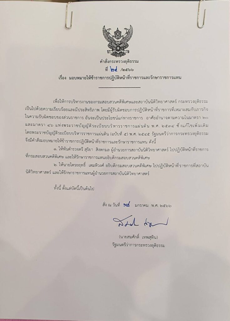 วันที่ 18 ม.ค.66 : ผู้สื่อข่าวรายงานว่า นายสมศักดิ์ เทพสุทิน รมว.ยุติธรรม ได้ลงนามในคำสั่งลงวันที่ 18 ม.ค.66 เรื่อง มอบหมายให้ข้าราชการปฏิบัติหน้าที่ราชการและรักษาราชการแทน โดยให้ นายไตรยฤทธิ์ เตมหิวงศ์ อธิบดีกรมสอบสวนคดีพิเศษ (DSI) ไปปฏิบัติราชการที่สถาบันนิติวิทยาศาสตร์ และรักษาราชการแทนผู้อำนวยการสถาบันนิติวิทยาศาสตร์ โดยให้ พ.ต.ต.สุริยา สิงหกมล ผอ.สถาบันนิติวิทยาศาสตร์ ไปปฏิบัติราชการ ที่กรมสอบสวนคดีพิเศษ และให้รักษาราชการแทนอธิบดีกรมสอบสวนคดีพิเศษ เพื่อให้การบริหารงานของกรมสอบสวนคดีพิเศษและสถาบันนิติวิทยาศาสตร์ กระทรวงยุติธรรม เป็นไปด้วยความเรียบร้อยและมีประสิทธิภาพ โดยมีผู้รับผิดชอบการปฏิบัติหน้าที่ราชการที่เหมาะสมกับภารกิจในความรับผิดชอบของส่วนราชการ ซึ่งจะเป็นประโยชน์ของทางราชการ โดยอาศัยอำนาจตามมาตรา 20 และมาตรา 46 แห่ง พ.ร.บ.ระเบียบบริหารราชการแผ่นดิน พ.ศ.2534 และแก้ไขเพิ่มเติม (ฉบับที่ 5) พ.ศ.2545 โดยมีผลตั้งแต่บัดนี้เป็นต้นไป