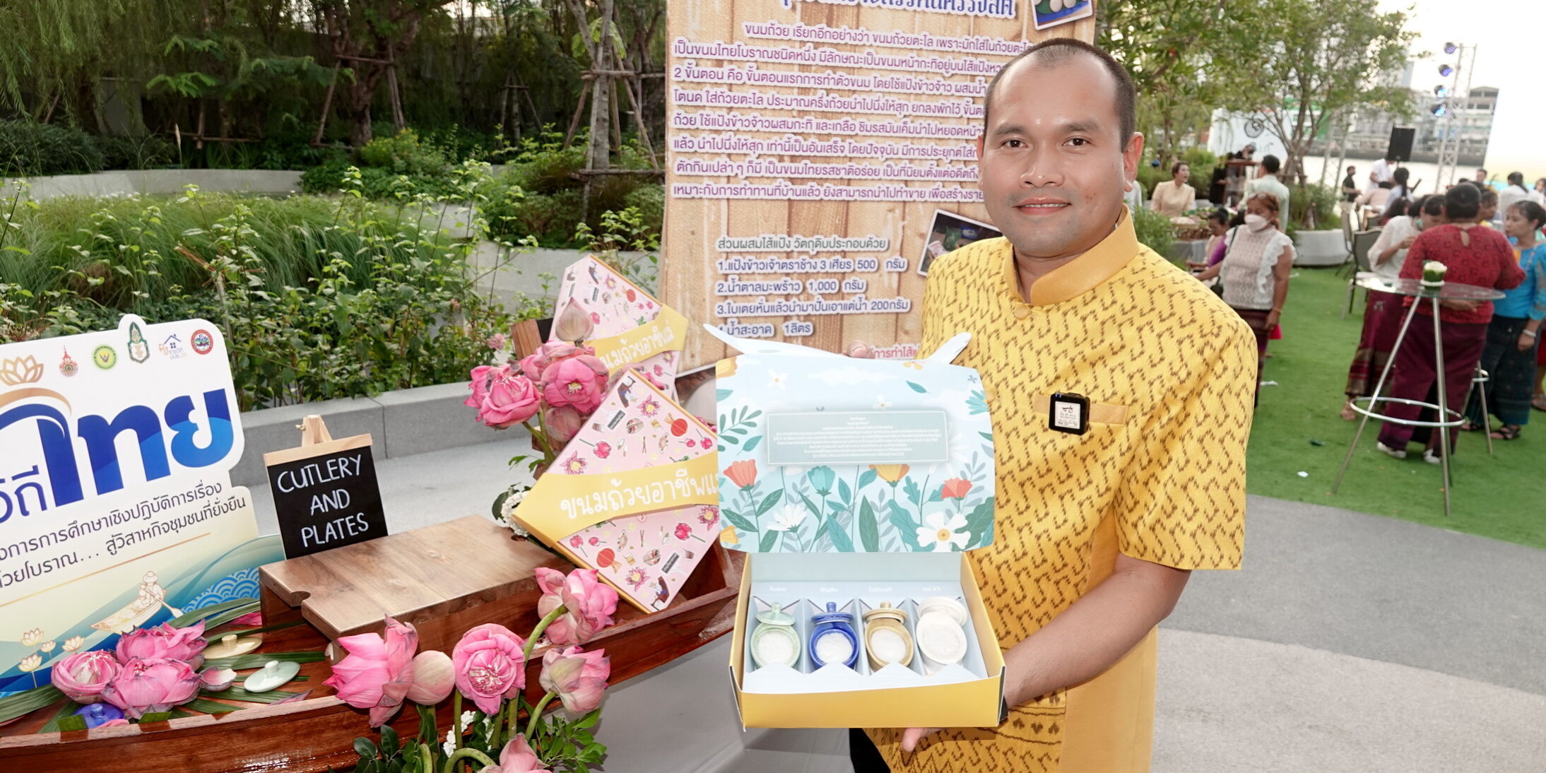 ร้อยตำรวจเอก ดร.ตรีลุพธ์ ธูปกระจ่าง นายกเทศมนตรีนครรังสิต กล่าวว่า ทางเทศบาลนครรังสิตได้รับความร่วมมือจากสถาบันพระปกเกล้า กลุ่มบ้านราชวิถี ปปร.26 ได้เห็นถึงความสำคัญขนมถ้วยภายในชุมชนของเรา จึงได้พัฒนาร่วมกับ มหาวิทยาลัยเทคโนโลยีราชมงคล และกรมวิทยาศาสตร์และบริการได้พัฒนารสชาติของขนมถ้วยรวมถึงบรรจุภัณฑ์ มี 4 สูตร ได้แก่ 1.สูตรใบเตย ที่เป็นประโยชน์ต่อการปรับสมดุลในร่างกาย บำรุงหัวใจ ปรับความดันโลหิต รักษาเบาหวาน โรคข้อและรูมาตอยด์ และขับปัสสาวะ 2.สูตรอัญชัน เป็นประโยชน์ต่อสายตา ลดน้ำตาลในปัสสาวะและเป็นยาระบายอ่อนๆ เพิ่มภูมิต้านทาน มีสารต้านอนุมูลอิสระ ป้องกันการเกิดมะเร็ง ชะลอริ้วรอย บำรุงผิวพรรณและเส้นผม และดีต่อระบบเลือด 3.สูตรข้าวไรซ์เบอร์รี่ ช่วยบำรุงหัวใจ พื้นฟูเซลล์และกระตุ้นการผลิตเซลล์ใหม่ในร่างกาย มีสารอาหารจำเป็นสำหรับการสร้างเซลล์เม็ดเลือดแดง ป้องกันการเป็นโรคโลหิตจาง ป้องกันมะเร็งบางชนิด ลดภาวะซึมเศร้า มีธาตุสังกะสี สังเคราะห์โปรตีน จึงสร้างคอลลาเจน มีส่วนช่วยรักษาสิว ป้องกันผมร่วง และกระตุ้นรากผมอีกด้วย 4.สูตรข้าว กข.43 เหมาะสำหรับคนที่ต้องการควบคุมอาหาร และควบคุมน้ำตาลคนเป็นโรคเบาหวาน สำหรับผลการทดลองขนมถ้วยพร้อมทานพบว่า การใช้กะทิพาสเจอร์ไรส์ทำหน้าขนมถ้วย เก็บที่อุณหภูมิ 2 องศาเซลเซียสจะช่วยให้สามารถเก็บรักษาขนมถ้วยให้มีสชาติคงเดิมได้นานถึง 10 วัน และได้ทดลองทำภาชนะเชรามิครูปเรือ สัญลักษณ์ของชุมชนคลองรังสิต และออกแบบแพคเกจสำหรับบรรจุขนมถ้วยในกรณีที่สามารถยกระดับตลาดที่มีมูลค่าสูงขึ้นอีกด้วย วันนี้เราพัฒนาขนมถ้วยแล้วต่อไปเราจะพัฒนาก๋วยเตี๋ยวเรืออีก ปัจจุบันเรานำก๋วยเตี๋ยวเรือโกฮับมาซึ่งเป็นต้นตำหรับก๋วยเตี๋ยวเรือรังสิต ซึ่งในอนาคตจะมีก๋วยเตี๋ยวเรือเป็นกึ่งสำเร็จรูปเพื่อสร้างอัตลักษณ์ของรังสิต ถือเป็นจุดเริ่มต้นของการพัฒนาวิสาหกิจชุมชนและในอนาคตอีก 1 ปีจะเป็นวิสาหกิจชุมชนเพื่อสังคมเพื่อที่จะนำรายได้มาทำให้เกิดประโยชน์ต่อสังคมต่อไป.