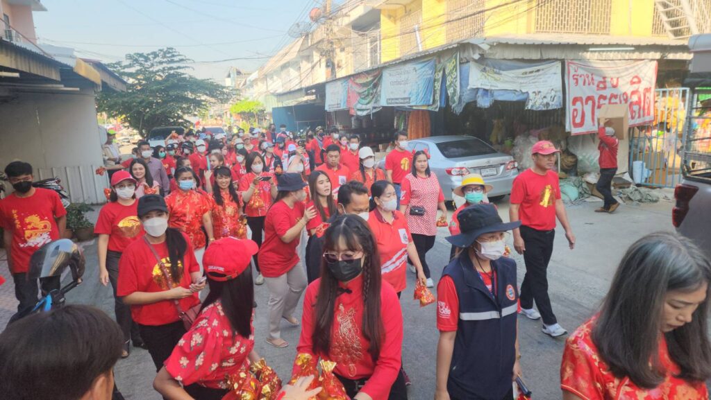 โดยการแจกส้มในครั้งนี้ ได้แบ่งออกเป็น 2 เส้นทาง โดยเส้นทางที่ 1 ได้แก่ ศาลเจ้าไต่ฮงกงรังสิต ศาลเจ้าพ่อเจ้าแม่คลองรังสิต ศาลพระพรหมตลาดสุชาติ ศาลพระพรหมตลาดพรพัฒน์ ศาลเจ้าพ่อเจ้าแม่ตลาดตลาดรังสิต ศาลหลักเมืองรังสิต ศาลตายายตลาดรังสิต ศาลพระพรหมชุมชนรัตนโกสินทร์ 200 และ หลวงพ่อพุทธโสธรชุมชนรัตนโกสินทร์ 200 ส่วนสายที่ 2 ได้แก่ ศาลเจ้าพ่อเสือชุมชนกรุงเทพเมืองใหม่ ศาลเจ้าพ่อเห้งเจีย มูลนิธิไทรทอง(ศาลเจ้าคลอง 1) พระรูปเสร็จพ่อ ร.5 (ตลาดพระรูป คลอง 2) พระพุทธรูป (สะพานแดง) ศาลตายาย (สะพานแดง) เจ้าแม่ต้นไทร(สะพานแดง) ศาลเจ้าแม่ตะเคียนทอง (หน้าอิงน้ำโฮเทล) และศาลเจ้าแม่ไทรทอง (หน้าลุมพีนี) เพื่อเป็นการอวยพรให้ทุกคนได้พบประสบแต่ความโชคดี มีความสำเร็จ ค้าขายร่ำรวย มีเงินมีทองใช้ตลอดปีและตลอดไป.