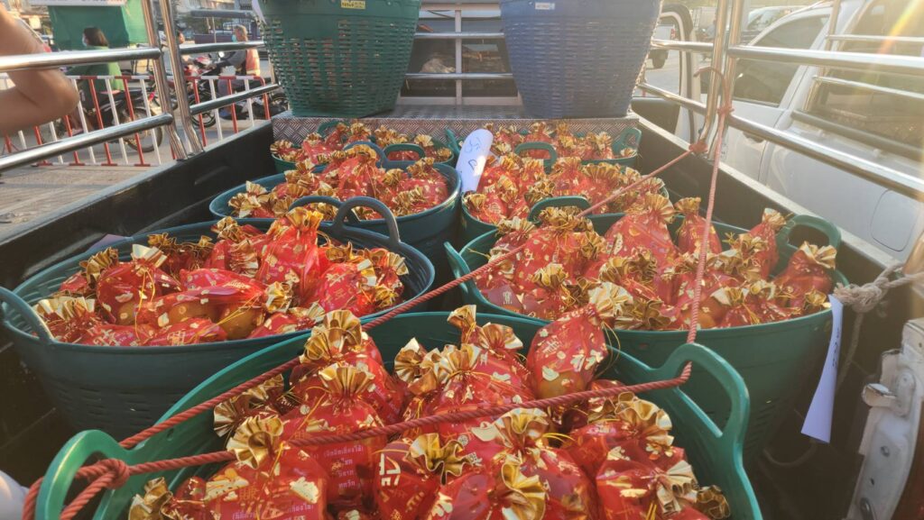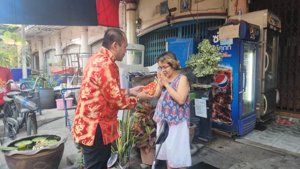 สำหรับการแจก ส้มมงคล ผลไม้แห่งความโชคดีและมั่งคั่งร่ำรวยของชาวจีนให้แก่บรรดาพ่อค้าแม่ค้า และประชาชน ถือเป็นธรรมเนียมที่ปฎิบัติกันมาอย่างยาวนาน สำหรับการ “ไป๊เจีย” หมายถึงการไหว้ขอพรแก่ผู้ใหญ่ที่เคารพนับถือด้วยการนำส้มไปมอบให้ เหตุผลที่ต้องเป็น “ส้ม” ก็เพราะว่าส้มเป็นผลไม้สิริมงคล มีสีผิวเหลืองเหมือนทอง และคำว่าส้มในภาษาจีน มีความหมายว่า ความสุข หรือ โชคลาภ ฉะนั้นการนำส้มไปให้ก็เปรียบเสมือนการนำความสุข โชคลาภไปให้นั่นเอง