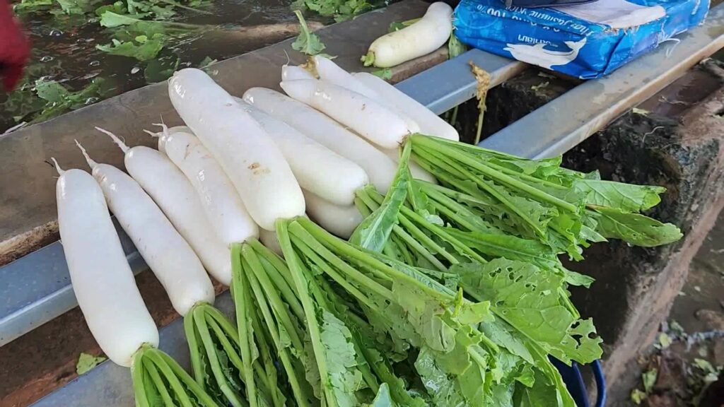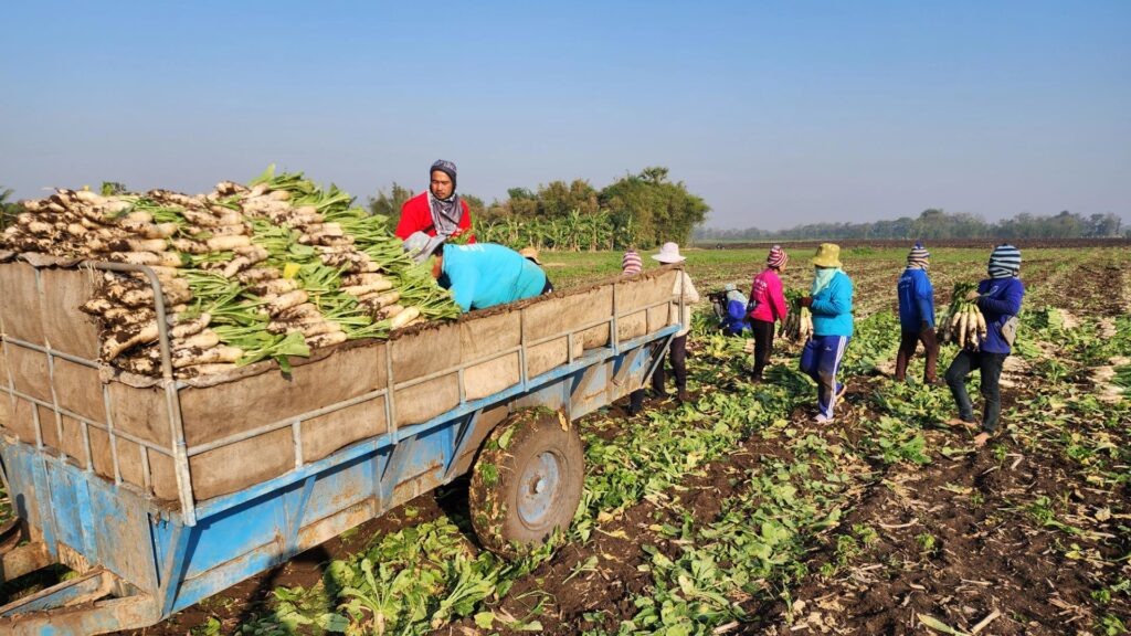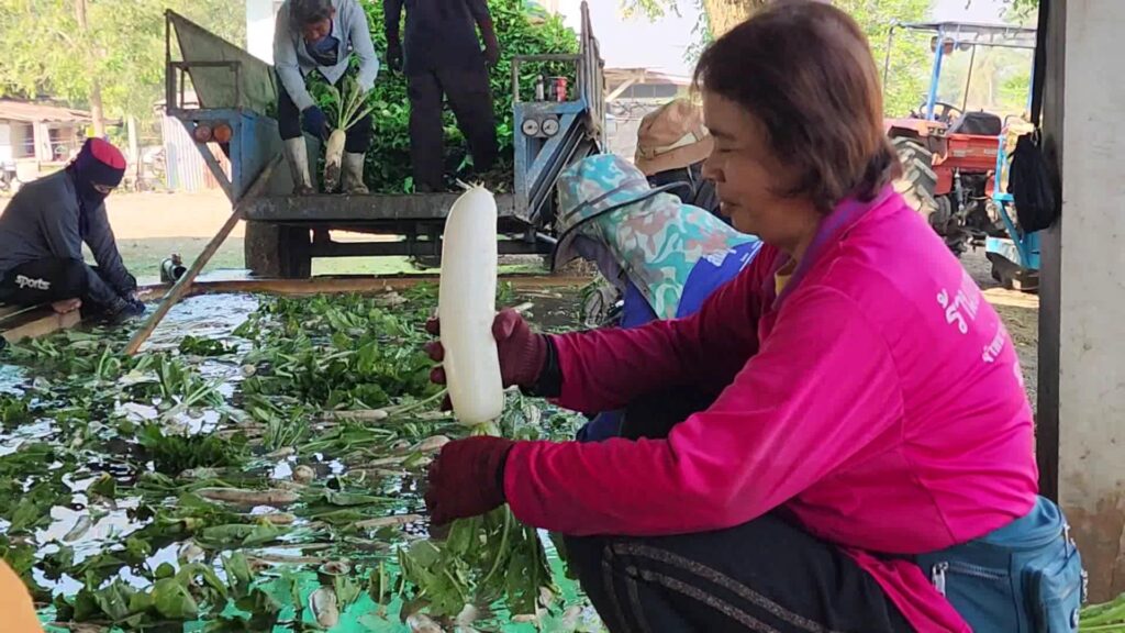 นายมานัส สุขเจริญ ซึ่งเป็น 1 ในเกษตรกรผู้ปลูกหัวไชเท้า ในพื้นที่ หมู่ 7 ตำบลโคกตูม อ.เมือง จ.ลพบุรี บอกว่า เกษตรกรผู้ปลูกหัวไชเท้า ของจังหวัดลพบุรี ส่วนใหญ่ หลังจากที่เกษตรกร เก็บเกี่ยวผลผลิต ข้าวโพด ไปแล้ว หรือว่างเว้นจากการทำนา ในช่วงปลายฝนต้นหนาว เกษตรกรส่วนใหญ่ก็จะหันมาปลูกหัวไชเท้า เพื่อไม่ให้พื้นที่ว่างเปล่า ถือเป็นการสร้างรายได้หลักอีกทางหนึ่งได้เป็นอย่างดี เนื่องจากผลผลิตของหัวไชเท้าที่ได้ในแต่ละปี ถือเป็นการสร้างรายได้ให้กับคนในชุมชนอย่างมาก ซึ่งส่วนใหญ่จะเน้นให้ผลผลผลิตออกสู่ตลาดในช่วงเทศกาลตรุษจีน เนื่องจากมีราคาดี และเป็นที่ต้องการของตลาด นอกจากนี้ชาวบ้านที่ไม่มีพื้นที่เพาะปลูกเป็นของตนเอง ก็จะมารับจ้างถอนหัวไชเท้าแล้วนำมาล้าง ตลอดจนถึงขั้นตอนการแพ็คนำส่งจำหน่ายให้กับพ่อค้าคนกลาง ซึ่งจะมีรายได้จากการถูกจ้าง เป็นชั่วโมงละ 35 บาท เฉลี่ยต่อวัน โดยประมาณ 300 – 400 บาทต่อคน