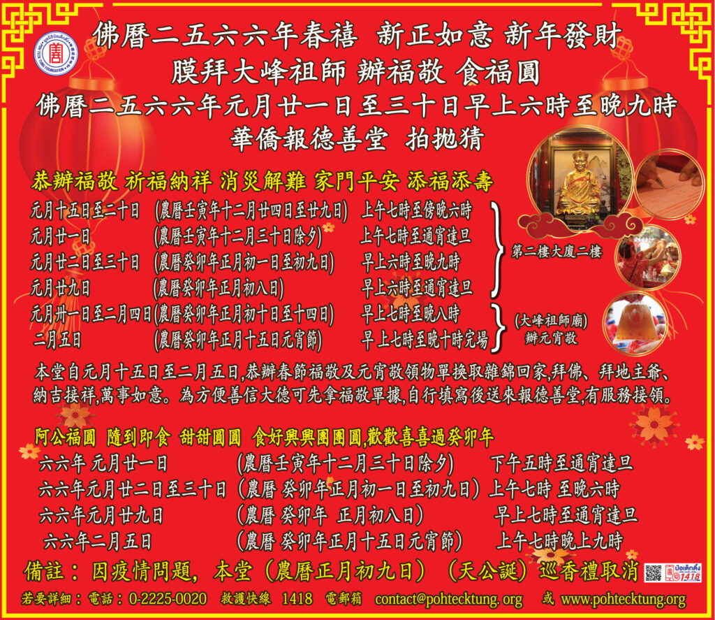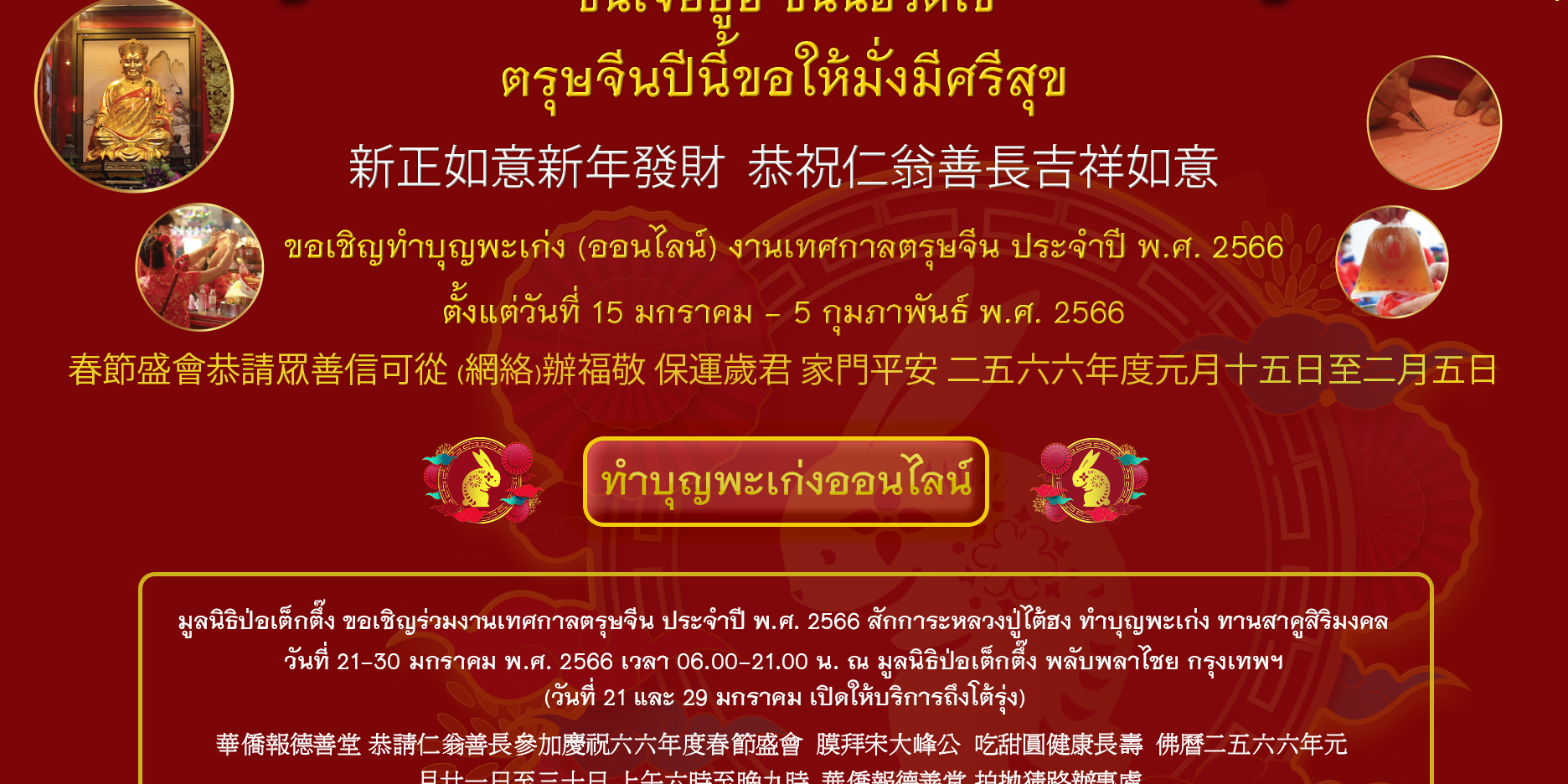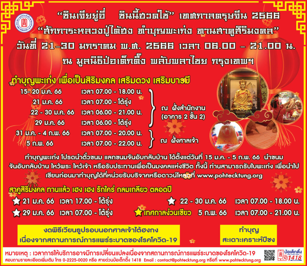 ระหว่างวันที่ 21 – 30 มกราคม 2566 มูลนิธิป่อเต็กตึ๊ง โดยนายวิเชียร เตชะไพบูลย์ ประธานกรรมการ ขอเชิญทุกท่าน ร่วม “สักการะหลวงปู่ไต้ฮง” ขอพรเนื่องในเทศกาลตรุษจีนเพื่อความเป็นสิริมงคลต้อนรับปีใหม่ ลงชื่อสวดชัยมงคลคาถา หรือ “พะเก่ง” เพื่อสะเดาะเคราะห์ ขอให้ครอบครัวมีสุข เสริมโชคลาภ เสริมดวงชะตา เสริมความมั่นคงสถาพร ตลอดปี พร้อมรับประทาน สาคูสิริมงคล เพื่อความกลมเกลียวและอยู่เย็นเป็นสุข พร้อมอัญเชิญฮู้ (ยันต์) ของหลวงปู่ไต้ฮง เพื่อนำไปประทับหน้าบ้าน เคหะสถาน หรือพกติดตัวเพื่อคุ้มครอง เคาะระฆังทอง ให้ก้องกังวานเพื่อให้ชีวิตสดใส การงานรุ่งเรืองระบือไกล และร่วมขอพรเทพยดาฟ้าดินเนื่องในวันประสูติ (ทีกงแซ) ซึ่งในปีนี้ตรงกับวันที่ 29 มกราคม 2566 ขออำนาจฟ้าดินเป็นที่พึ่ง ขอให้สิ่งศักดิ์สิทธิ์ที่ตนนับถือ เช่น หลวงปู่ไต้ฮง ช่วยดลบันดาลให้ประสบโชคดีตลอดปีใหม่ (โดยในวันที่ 21 และ 29 มกราคม 2566 มูลนิธิป่อเต็กตึ๊ง เปิดบริการโต้รุ่ง)
