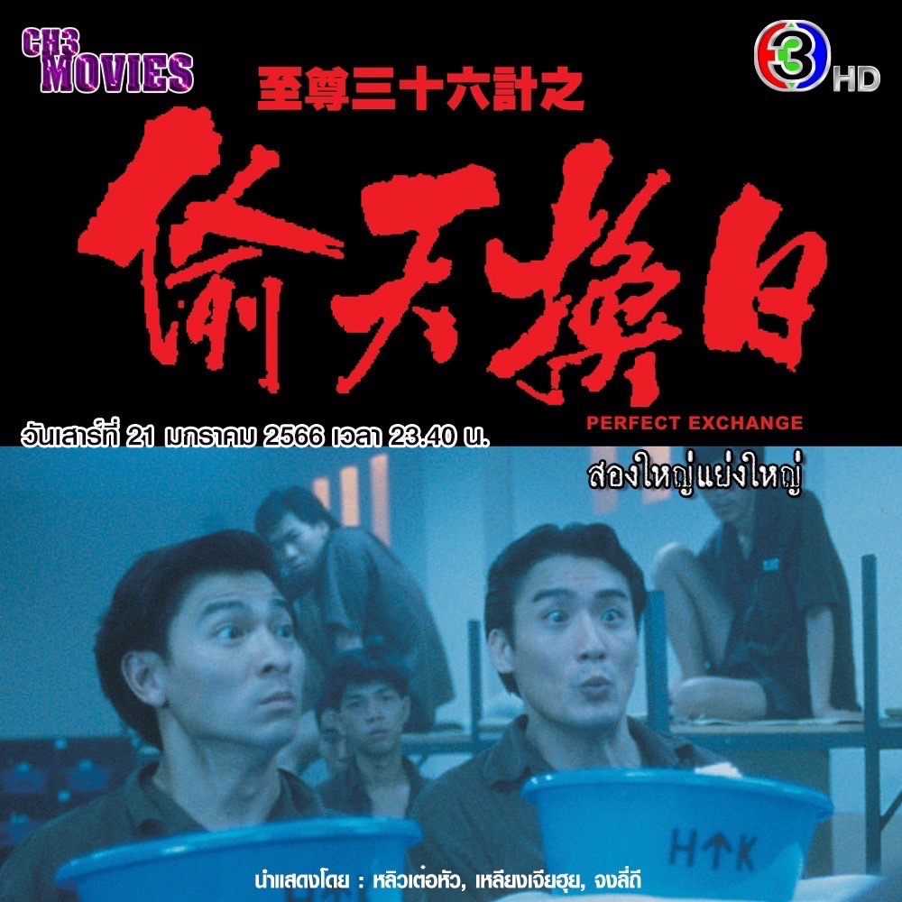 ช่วงเวลา 23.55 น. พบกับ “แชนแนลทรีมูฟวี่ส์” นำเสนอภาพยนตร์ “สองใหญ่แย่งใหญ่ (Perfect Exchange)” นำแสดงโดย : หลิวเต๋อหัว, เหลียงเจียฮุย, จงลี่ถี เรื่องของ ฉิน เซียนพนันที่หลอกเอาเงินจาก เหลา ซึ่งเป็นเศรษฐีเจ้าของบ่อนดังนั้น เหลาจึงซ้อนแผนให้ฉินเข้าไปจัดการกับพ่อตาคือ โรบินสัน ในคุกเพื่อให้บอกที่ซ่อนของพันธบัตร แต่ฉินตัดสินใจเข้าช่วยโรบินสันแทน และหลอกใช้ หง ที่เป็นคนบ้าเซ็กซ์และโง่เง่าเป็นผู้คุมจอมตลกในคุกให้เป็นผู้ช่วย