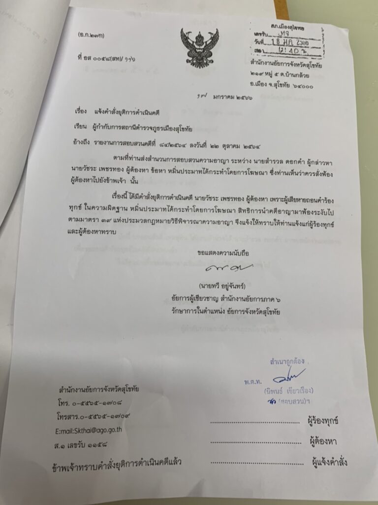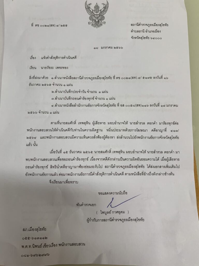 (22 ม.ค.66) นายวัชระ เพชรทอง อดีตส.ส.พรรคประชาธิปัตย์ เปิดเผยว่า ได้รับหนังสือที่ ตช 0021 (สท).4/255สถานีตำรวจภูธรเมืองสุโขทัย ตำบลธานี อำเภอเมือง จังหวัดสุโขทัย ลงวันที่ 18 มกราคม 2566 เรื่อง แจ้งคำสั่งยุติการดำเนินคดี สำเนาถอนคำร้องทุกข์ และสำเนาหนังสือสำนักงานอัยการจังหวัดสุโขทัย ที่ อส.0054(สท)116 ลงวันที่ 17 มกราคม 2566 ซึ่งในหนังสือระบุว่าตามที่นายสมศักดิ์ เทพสุทิน ผู้เสียหาย มอบอำนาจให้ นายสำรวล ดอกคำ มาร้องทุกข์ต่อพนักงานสอบสวนให้ดำเนินคดีกับตนในความผิดฐานหมิ่นประมาทด้วยการโฆษณา คดีอาญาที่ 413/2564 และพนักงานสอบสวนมีความเห็นควรสั่งฟ้องผู้ต้องหา ส่งสำนวนไปยังพนักงานอัยการจังหวัดสุโขทัยแล้วนั้น เมื่อวันที่ 15 ธันวาคม 2565 นายสมศักดิ์ เทพสุทิน มอบอำนาจให้นายสำรวล ดอกคำ มาพบพนักงานสอบสวนเพื่อขอถอนคำร้องทุกข์ เนื่องจากคดีดังกล่าวเป็นความผิดอันยอมความได้ เมื่อผู้เสียหายถอนคำร้องทุกข์ สิทธินำคดีอาญามาฟ้องย่อมระงับไป สถานีตำรวจภูธรเมืองสุโขทัย ได้ส่งเอกสารเพิ่มเติมไปยังพนักงานอัยการแล้ว ต่อมาพนักงานอัยการมีคำสั่งยุติการดำเนินคดี