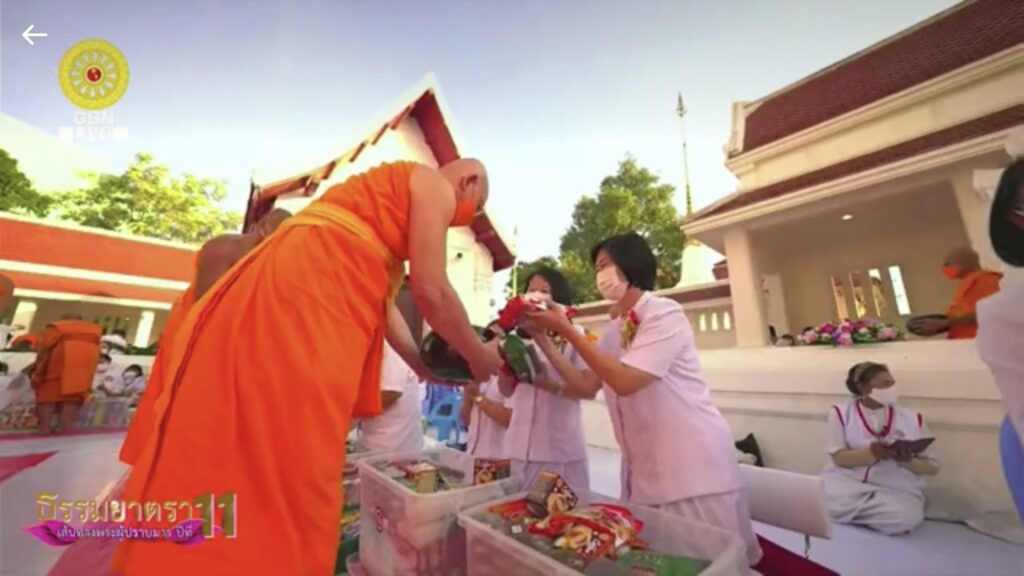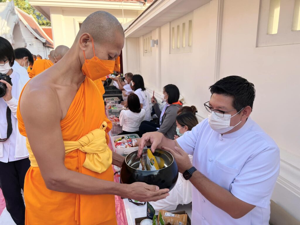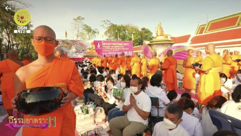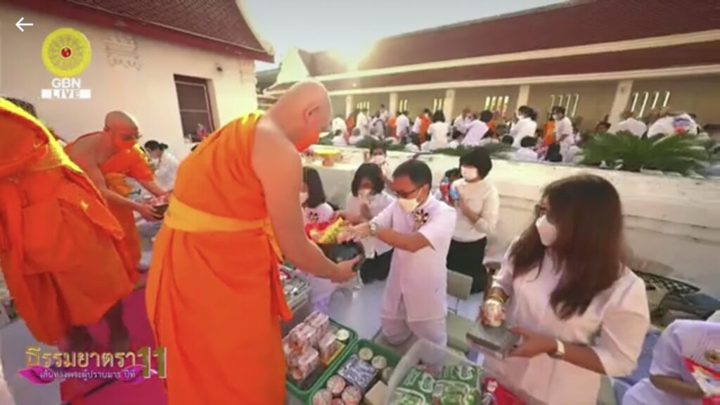 โดยมี พระครูวิบูลนิติธรรม ผู้ช่วยเจ้าอาวาสวัดพระธรรมกาย เมตตาเป็นประธานสงฆ์ และ นายสุรสีห์ ศรีอินทร์สุทธ์ ประธานหอการค้าจังหวัดนนทบุรี ประธานฝ่ายฆราวาส ในพิธีตักบาตรพระธรรมยาตรา 1,139 รูป โครงการธรรมยาตราฯ พิธีตักบาตรครั้งนี้ มีพุทธศาสนิชน และประชาชนผู้มีจิตศรัทธาเข้าร่วมพิธีจำนวนมาก ถือเป็นวัฒนธรรมประเพณีชาวพุทธที่ดีงาม และเป็นทางมาแห่งบุญให้แก่สาธุชนให้สั่งสม อีกทั้ง เป็นการสืบทอดอายุของพระพุทธศาสนา น้อมถวายเป็นกตัญญูบูชาแด่มหาปูชนียาจารย์ สืบสานพุทธประเพณีการทำบุญตักบาตรให้เจริญรุ่งเรื่องสืบไป นอกจากนี้ ยังมีพุทธศาสนิกชนทั่วโลกร่วมพิธี และเป็นเทศกาลตอนรับปีใหม่ของพี่น้องชาวไทยเชื้อสายจีน (วัดตรุษจีน) และอนุโมทนาผ่านออนไลน์ทาง ZOOM และช่อง GBN ด้วย ส่วนภาคบ่าย เวลา 15.00 น. มีกิจกรรมต้อนรับพระธรรมยาตราจากวัดบางเลน ไปยังอนุสรณ์สถานบางปลา วัดบางปลา อ.บางเลน จ.นครปฐม อนุสรณ์สถาน ลำดับที่ 5 “สถานที่เผยแผ่วิชชาธรรมกายครั้งแรก” ของพระเดชพระคุณพระมงคลเทพมุนี (สด จนฺทสโร) พระผู้ปราบมาร