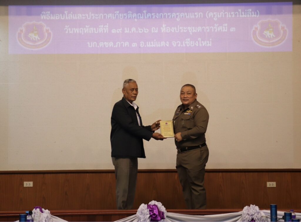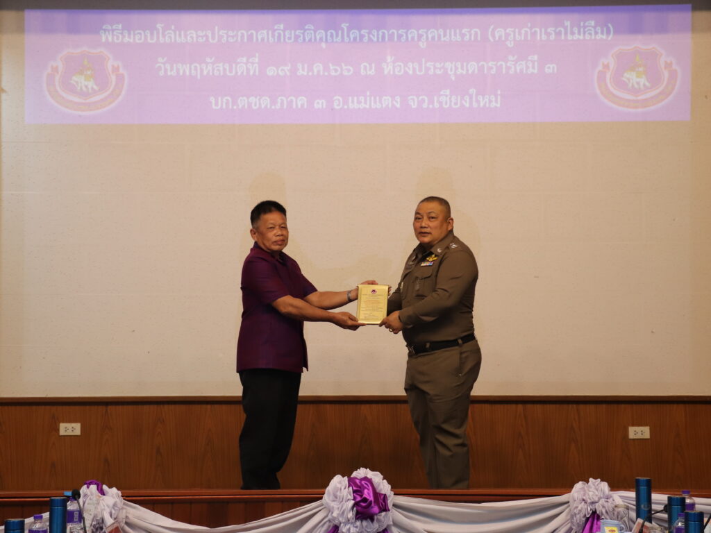 พลตำรวจตรี ประกอบ พลเตชา ผู้บังคับการตำรวจตระเวนชายแดนภาค 3 มอบโล่และประกาศเกียรติคุณแก่ครูคนแรกที่ก่อตั้งโรงเรียนตำรวจตระเวนชายแดน ผลิตเด็กและเยาวชนที่มีคุณภาพออกสู่สังคมมาเป็นเวลากว่า 60 ปี ตาม “โครงการตามหาครูคนแรกโรงเรียนตำรวจตระเวนชายแดน ภาค 3 (โครงการครูเก่าเราไม่ลืม)”