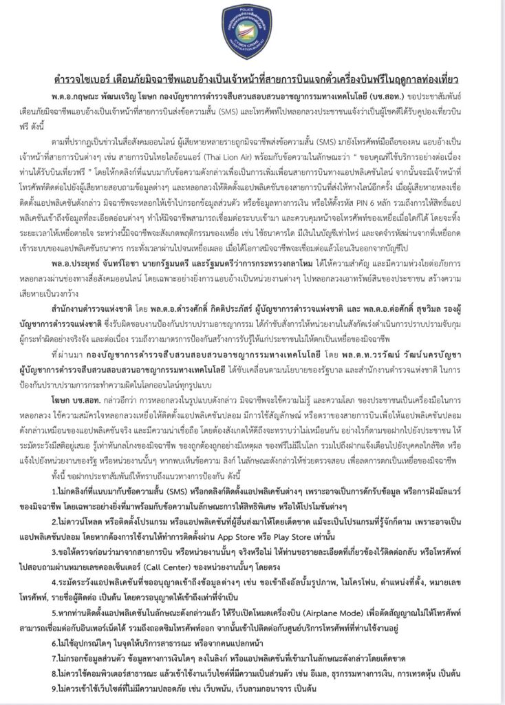 พ.ต.อ.กฤษณะ พัฒนเจริญ โฆษก กองบัญชาการตำรวจสืบสวนสอบสวนอาชญากรรมทางเทคโนโลยี (บช.สอท.) ขอประชาสัมพันธ์เตือนภัยมิจฉาชีพแอบอ้างเป็นเจ้าหน้าที่สายการบินส่งข้อความสั้น (SMS) และโทรศัพท์ไปหลอกลวงประชาชนแจ้งว่าเป็นผู้โชคดีได้รับคูปองเที่ยวบินฟรี ดังนี้