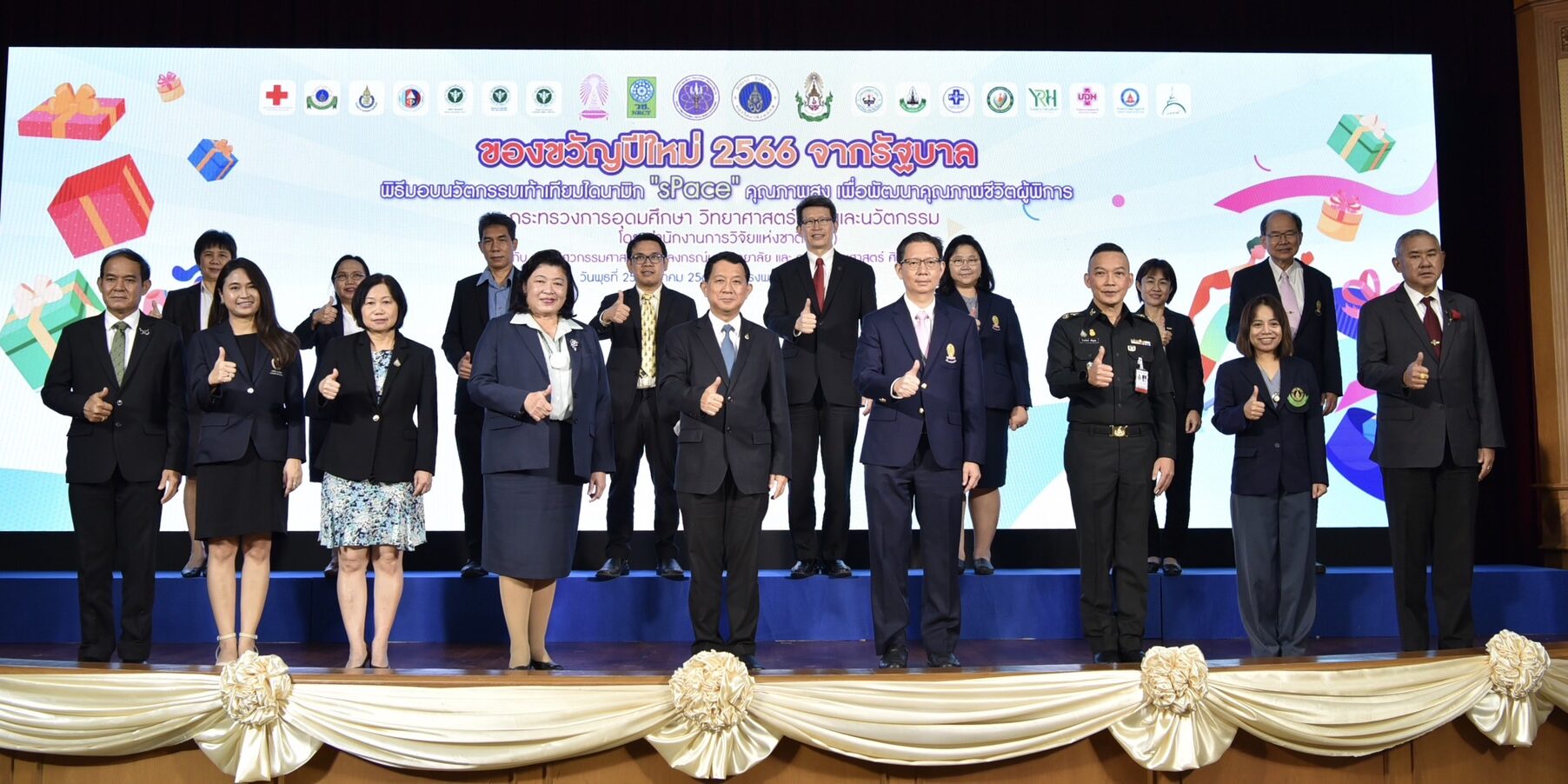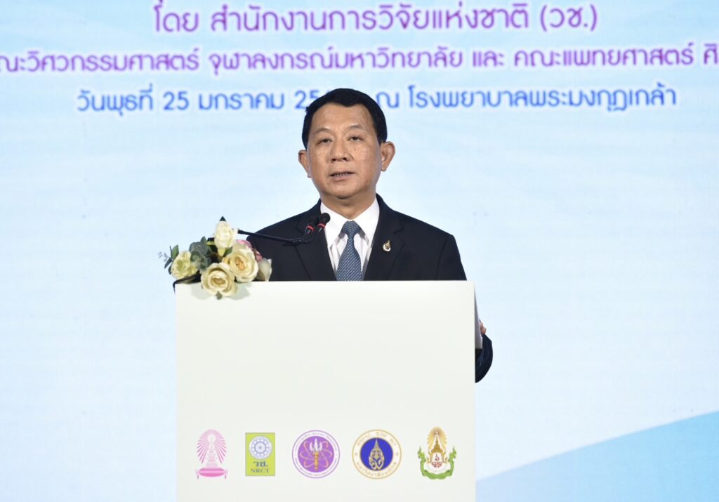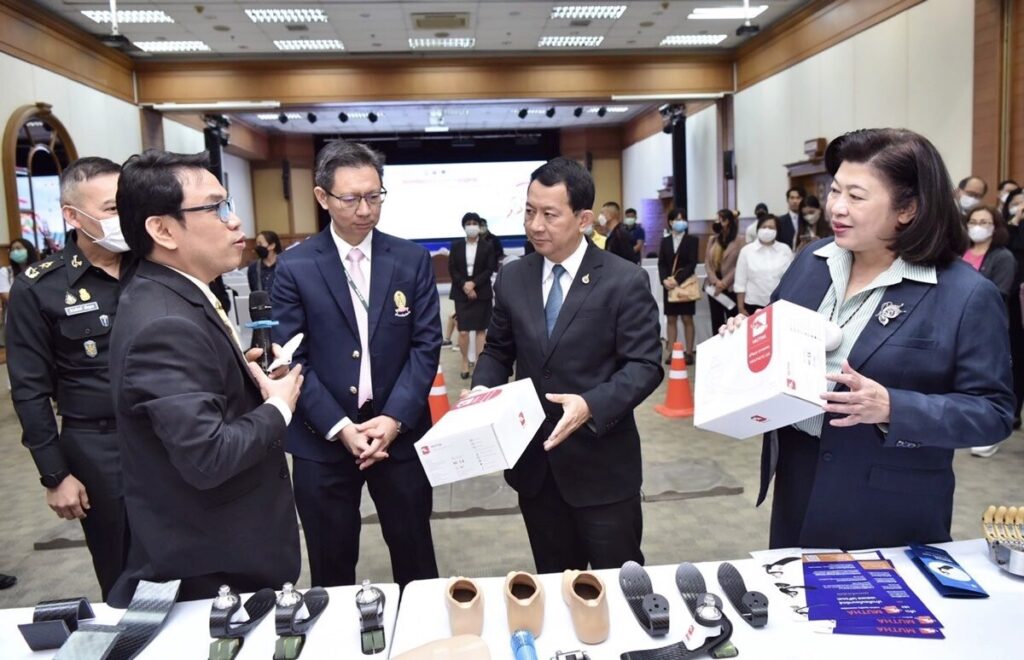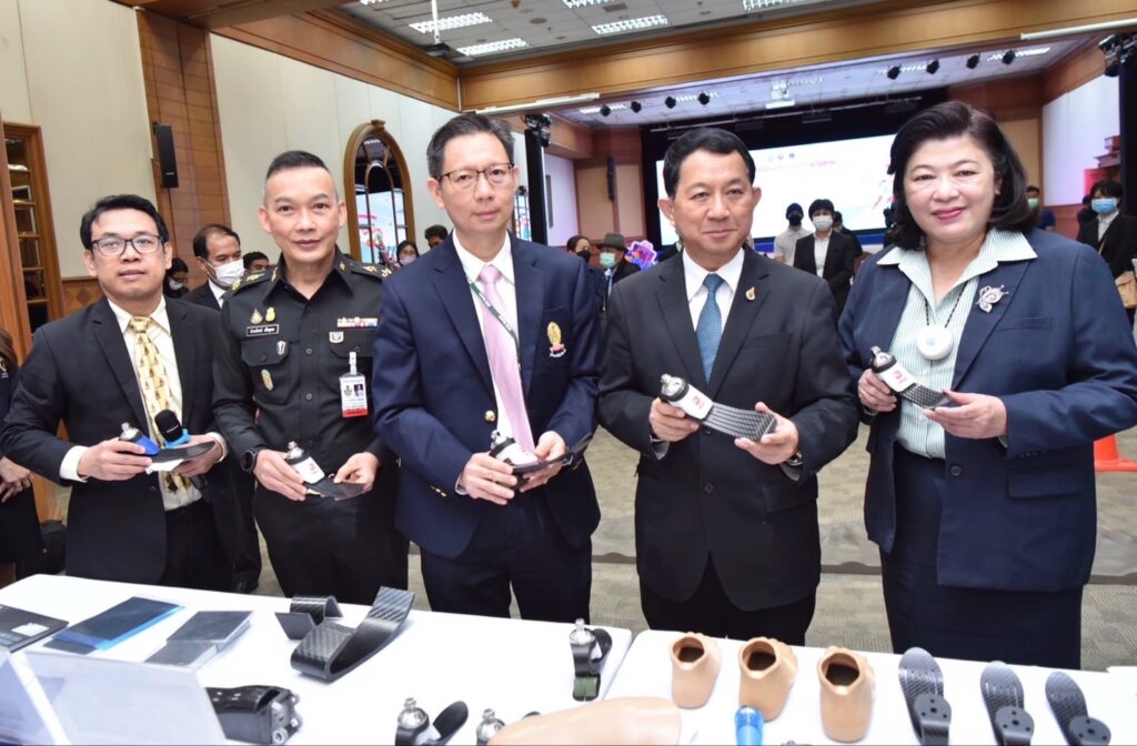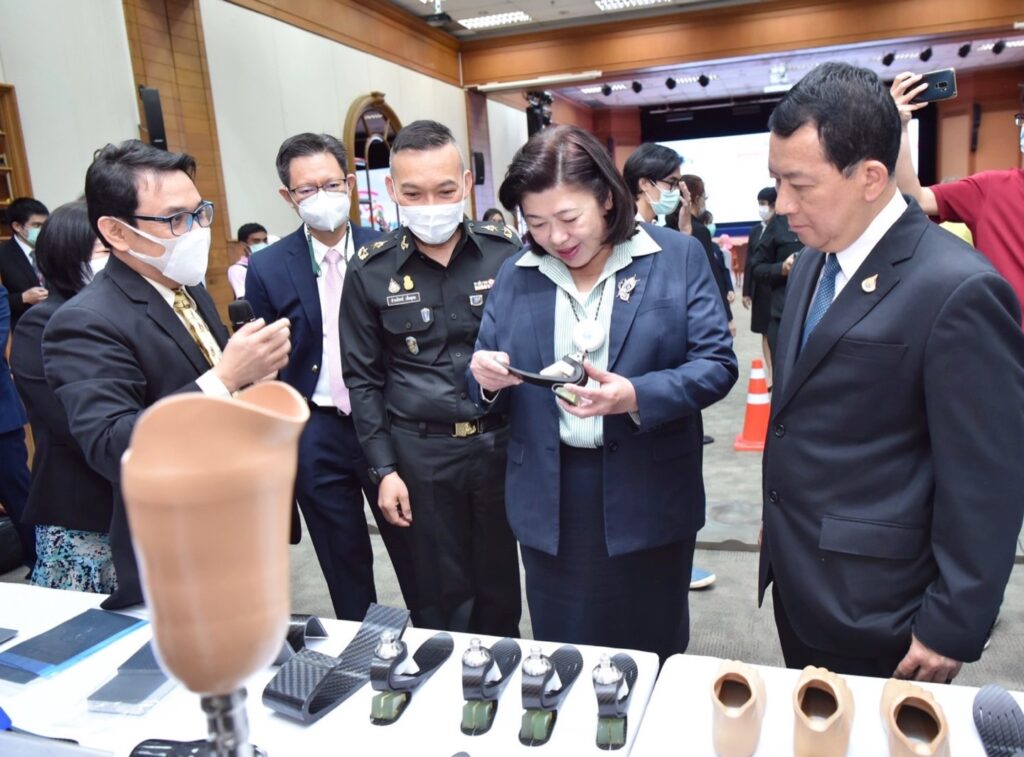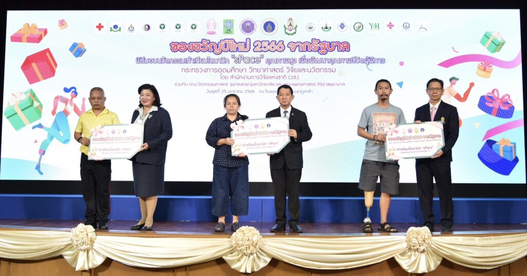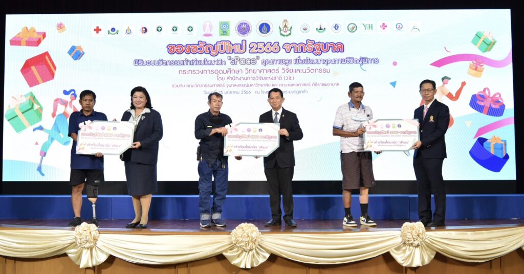 กระทรวงการอุดมศึกษา วิทยาศาสตร์ วิจัยและนวัตกรรม (อว.) โดย สำนักงานการวิจัยแห่งชาติ (วช.) ร่วมกับ คณะวิศวกรรมศาสตร์ จุฬาลงกรณ์มหาวิทยาลัย และ คณะแพทยศาสตร์ ศิริราชพยาบาล จัดพิธีส่งมอบนวัตกรรมเท้าเทียมไดนามิก “sPace” คุณภาพสูง เพื่อพัฒนาคุณภาพชีวิตผู้พิการ ภายใต้โครงการของขวัญปีใหม่ของรัฐบาล 2566 แก่ โรงพยาบาลพระมงกุฎเกล้า และโรงพยาบาลในเครือข่าย เพื่อนำไปใช้ประโยชน์ โดย ศาสตราจารย์ ดร.นพ.สิริฤกษ์ ทรงศิวิไล ปลัดกระทรวงการอุดมศึกษา วิทยาศาสตร์ วิจัยและนวัตกรรม (อว.) เป็นผู้ส่งมอบฯ ดร.วิภารัตน์ ดีอ่อง ผู้อำนวยการสำนักงานการวิจัยแห่งชาติ (วช.) เป็นผู้กล่าวรายงานฯ และพลตรี ธำรงโรจน์ เต็มอุดม ผู้อำนวยการโรงพยาบาลพระมงกุฎเกล้า กล่าวต้อนรับ ณ ห้องประชุมชั้น 10 อาคารพัชรกิติยาภา โรงพยาบาลพระมงกุฎเกล้า เขตราชเทวี กรุงเทพมหานคร
