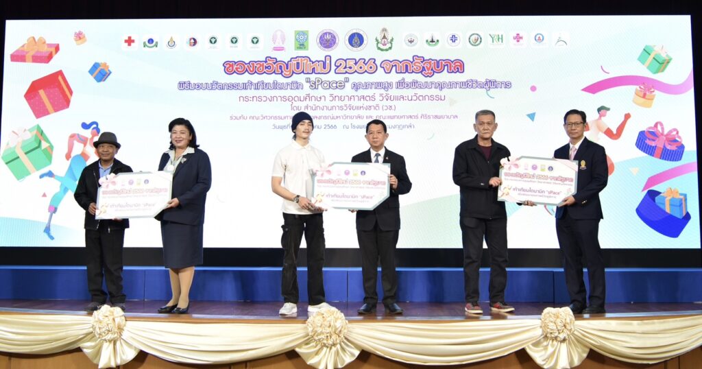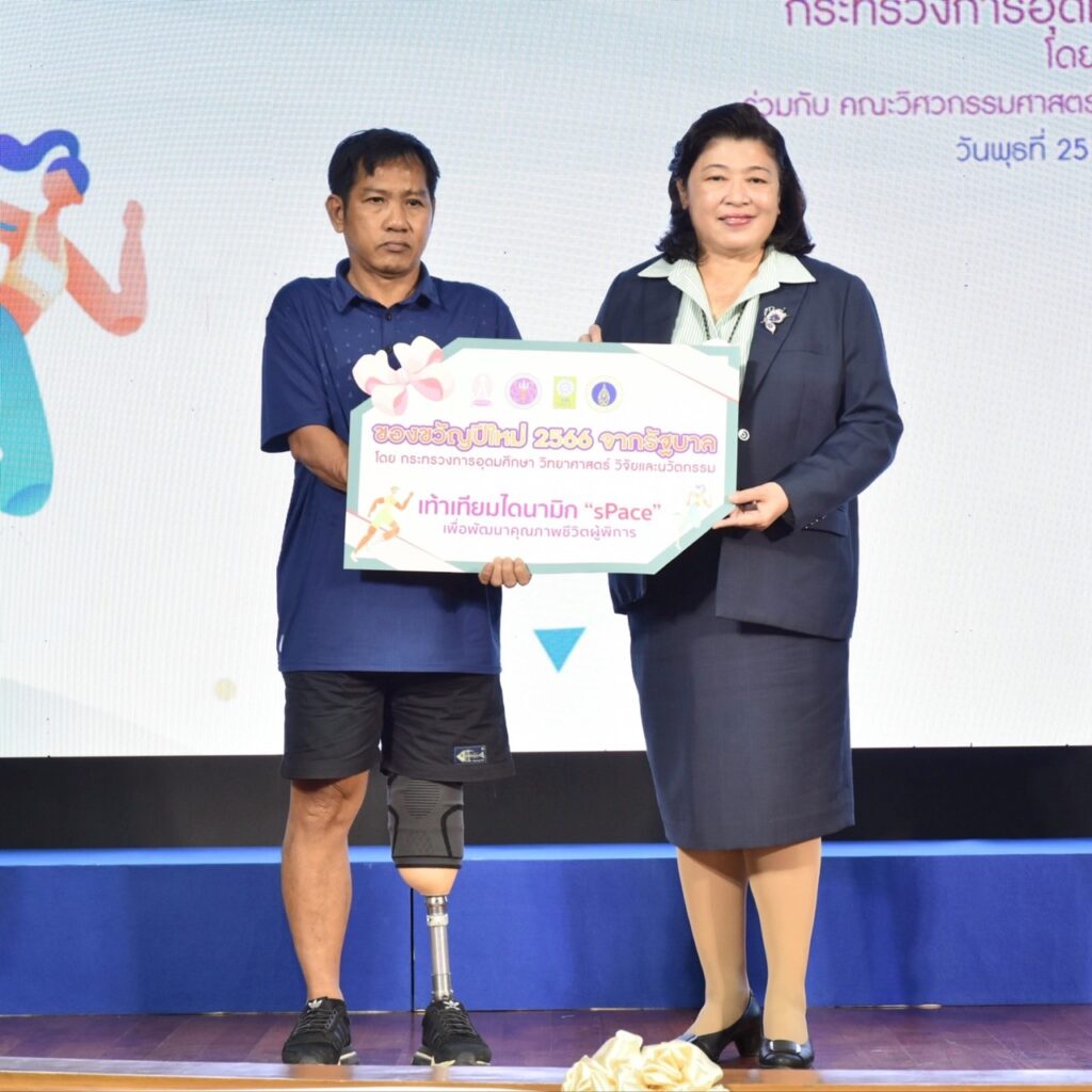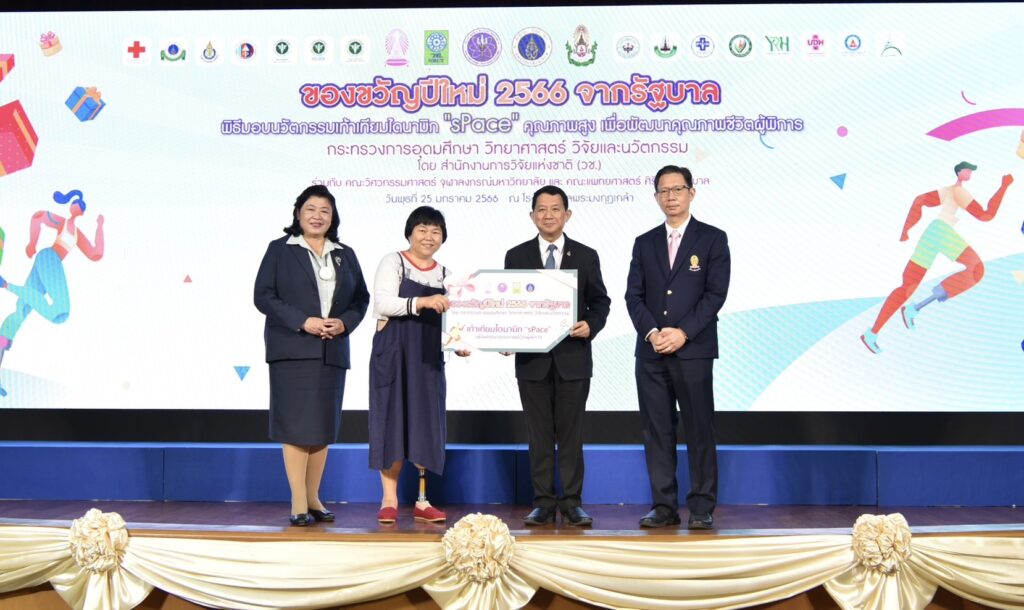 ศาสตราจารย์ ดร.นพ.สิริฤกษ์ ทรงศิวิไล ปลัดกระทรวงการอุดมศึกษา วิทยาศาสตร์ วิจัยและนวัตกรรม (อว.) กล่าวว่า รู้สึกยินดีที่เป็นผู้แทนของกระทรวง (อว.) ในนามรัฐบาล ได้มอบของขวัญปีใหม่ ปี 2566 ให้กับประชาชน ซึ่งเป็นผลงานที่หน่วยงานต่างได้ดำเนินการพัฒนาและคิดค้นให้เกิดนวัตกรรมที่เกิดประโยชน์กับประชาชน ปีนี้กระทรวง (อว.) ขอมอบนวัตกรรมเท้าเทียมไดนามิก “sPace” ของคณะวิศวกรรมศาสตร์ จุฬาลงกรณ์มหาวิทยาลัย และ โรงเรียนกายอุปกรณ์สิรินธร คณะแพทยศาสตร์ศิริราชพยาบาล มหาวิทยาลัยมหิดล ที่ได้ร่วมกันพัฒนาขึ้น เป็นเท้าเทียมที่มีคุณภาพสูงผลิตจากคาร์บอนไฟเบอร์ ออกแบบและผลิตในประเทศไทย ซึ่งเท้าเทียมจะทำให้การเดินของผู้พิการที่ต้องใส่ขาเทียมเดินได้สะดวกขึ้น มีน้ำหนักเบาและมีแรงส่ง สิ่งเหล่านี้เป็นสิ่งสำคัญที่กระทรวง (อว.) มอบหมายให้ (วช.) ดำเนินการเป็นผลสำเร็จ
