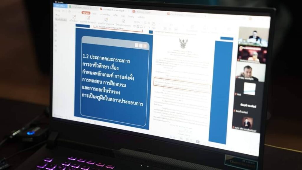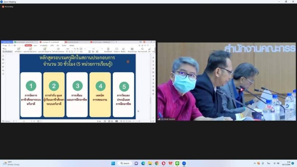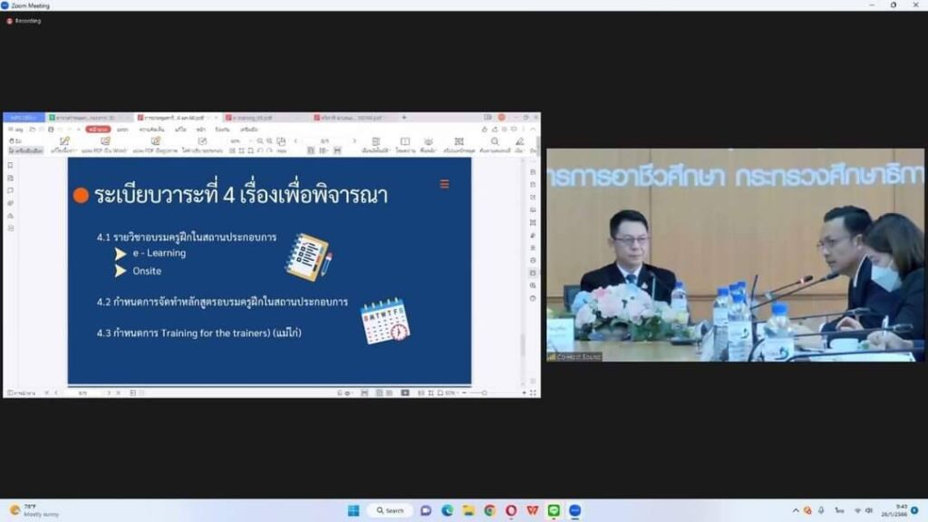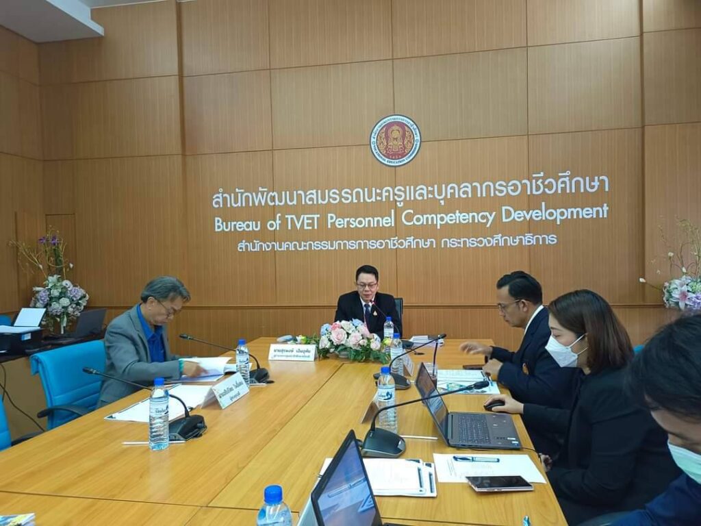 ดร.สุรพงษ์ เอิมอุทัย ผู้อำนวยการศูนย์อาชีวศึกษาทวิภาคี เป็นประธานการประชุมหารือวางแผนการจัดทำหลักสูตรอบรมครูฝึกในสถานประกอบ ณ ห้องประชุมราชพฤกษ์ 2 สำนักพัฒนาสมรรถนะครูและบุคลากรอาชีวศึกษา และประชุม Online ผ่าน ZOOM มีผู้เข้าร่วมประชุมนำโดย ว่าที่ร้อยเอกเชาวลิต ยุทธนาวา ผู้อำนวยการวิทยาลัยบริหารธุรกิจและการท่องเที่ยวกรุงเทพ นางสาวฉันทนา โพธิครูประเสริฐ ผู้อำนวยการวิทยาลัยสารพัดช่างสุราษฎร์ธานี