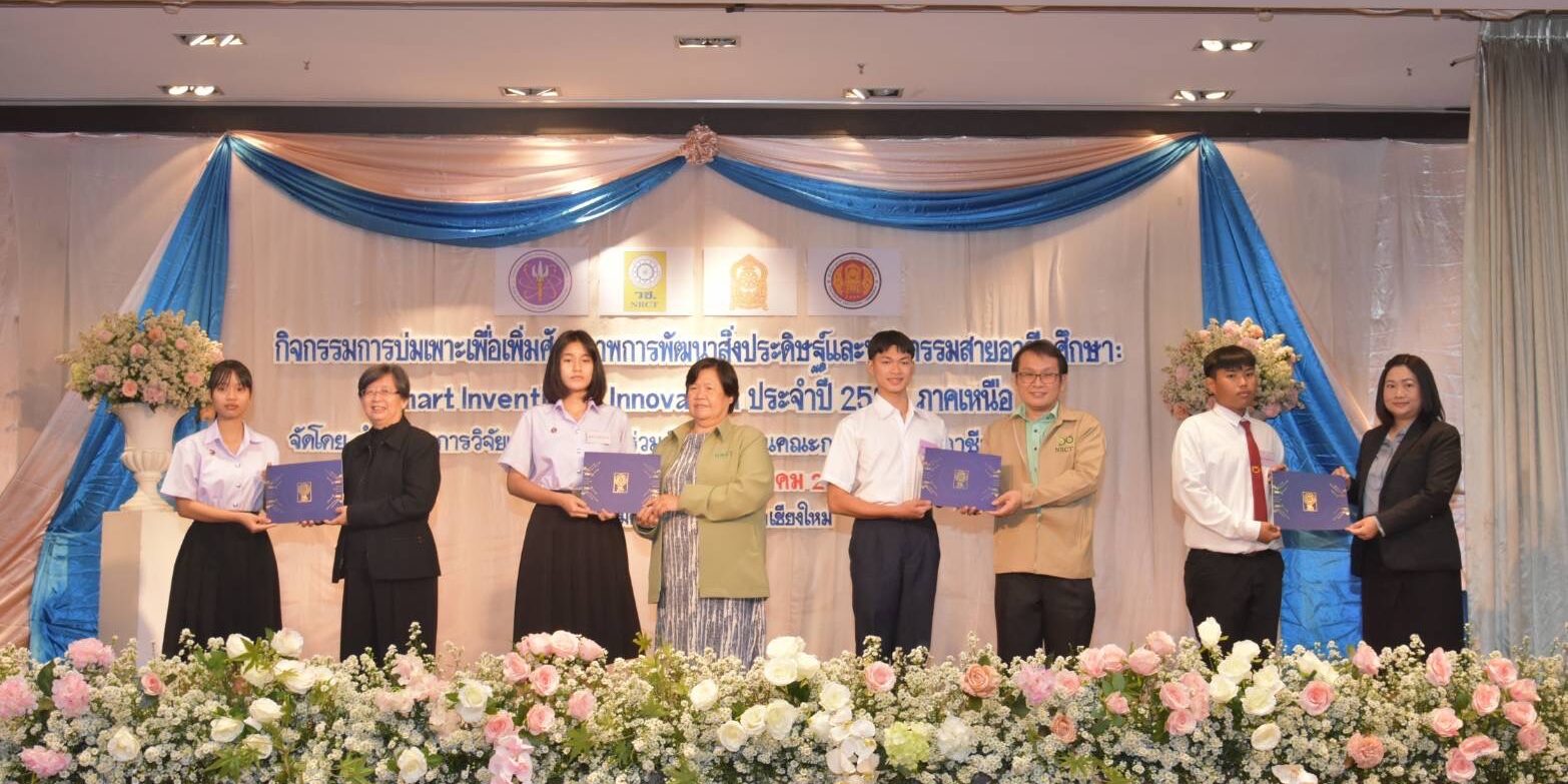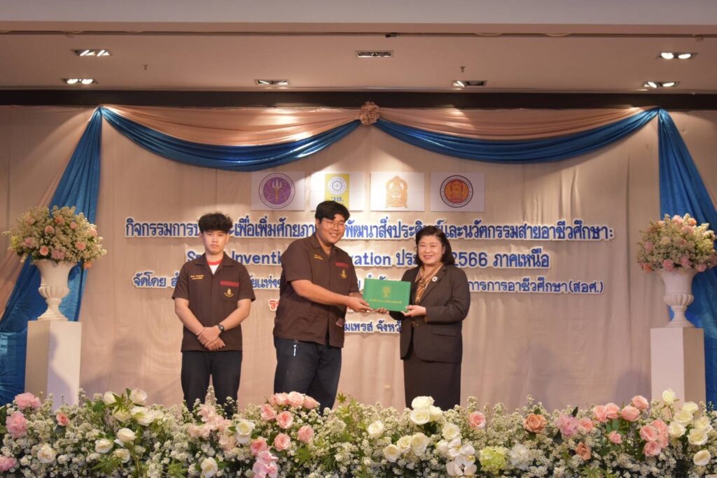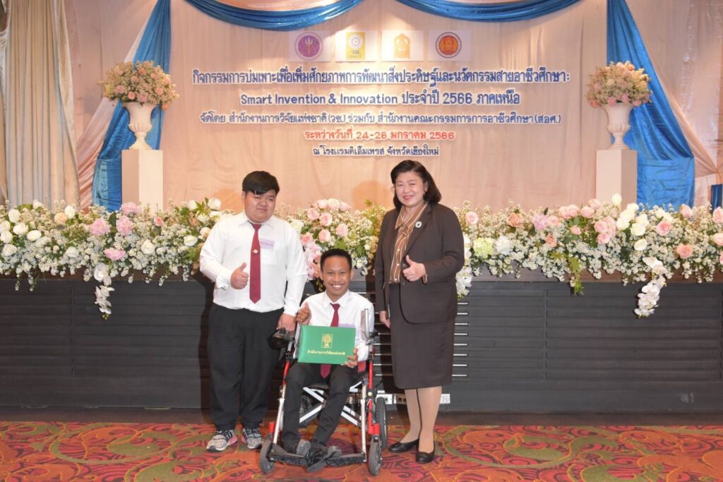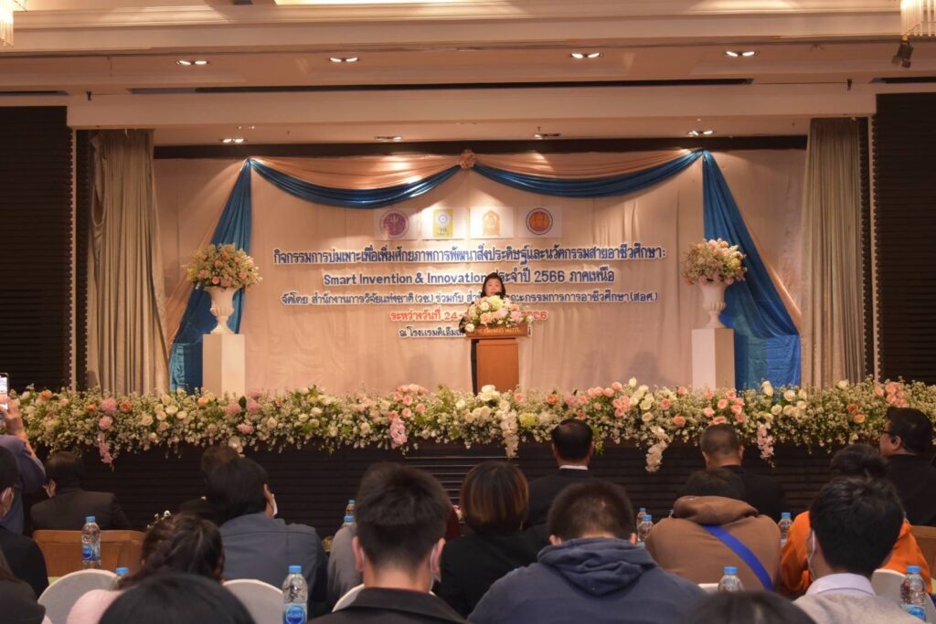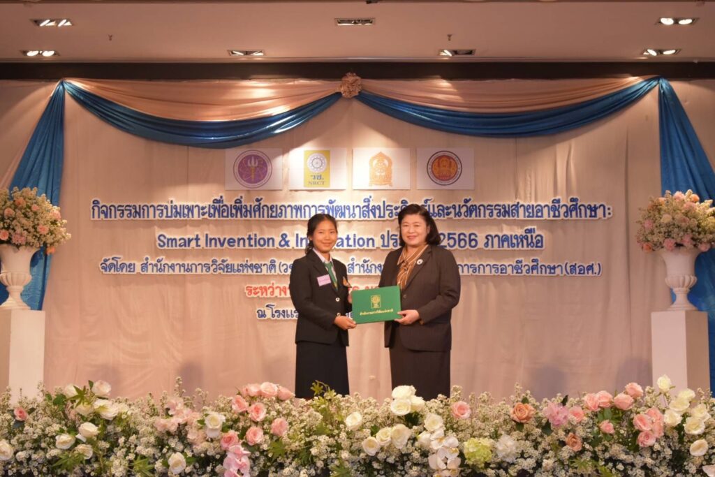 วันที่ 26 มกราคม 2566 สำนักงานการวิจัยแห่งชาติ (วช.) กระทรวงการอุดมศึกษา วิทยาศาสตร์ วิจัยและนวัตกรรม (อว.) ร่วมกับ สำนักงานคณะกรรมการการอาชีวศึกษา (สอศ.) จัดพิธีมอบรางวัลติดดาวผลงานเด่นอาชีวศึกษา ในกิจกรรม “การบ่มเพาะเพื่อเพิ่มศักยภาพการพัฒนาสิ่งประดิษฐ์และนวัตกรรมสายอาชีวศึกษา : Smart Invention & Innovation ประจำปี 2566 ภาคเหนือ” วันสุดท้าย โดย ดร.วิภารัตน์ ดีอ่อง ผู้อำนวยการสำนักงานการวิจัยแห่งชาติ (วช.) เป็นประธาน เพื่อส่งเสริมและสนับสนุนการพัฒนาศักยภาพของนักเรียน นักศึกษาสายอาชีวศึกษาให้เกิดแรงจูงใจในการคิดค้นผลงานประดิษฐ์และนวัตกรรมเพื่อใช้ในประเทศ ณ โรงแรมดิเอ็มเพรส จังหวัดเชียงใหม่