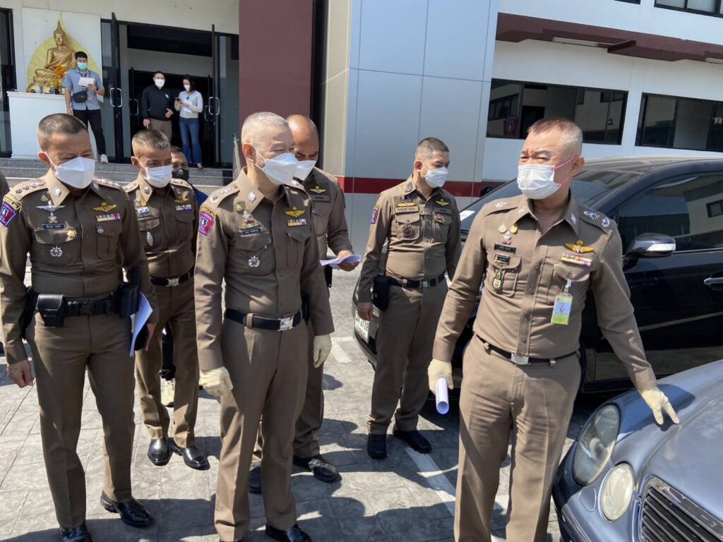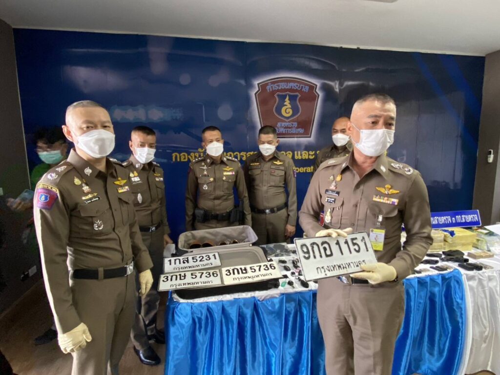 พล.ต.ต.โชคชัย งามวงศ์ รอง ผบช.น.,พล.ต.ต.ภานพ วรธนัชชากุล ผบก.สปพ.,พ.ต.อ.ประสงค์ อานมณี รอง ผบก.สปพ.,พ.ต.อ.โรจน์นินทร์ ทองใบ รอง ผบก.สปพ.,พ.ต.อ.พิทักษ์ สุทธิกุล รอง ผบก.สปพ.,พ.ต.อ.ชัยกฤต โพธิ์อ๊ะ รอง ผบก.สปพ. และเจ้าหน้าที่ที่เกี่ยวข้อง ร่วมแถลงข่าวกรณี “191 ปิดจ๊อบบังมัส เจ้าพ่อเครือข่ายพัสดุยานรก” จับกุมผู้ต้องหา 5 ราย