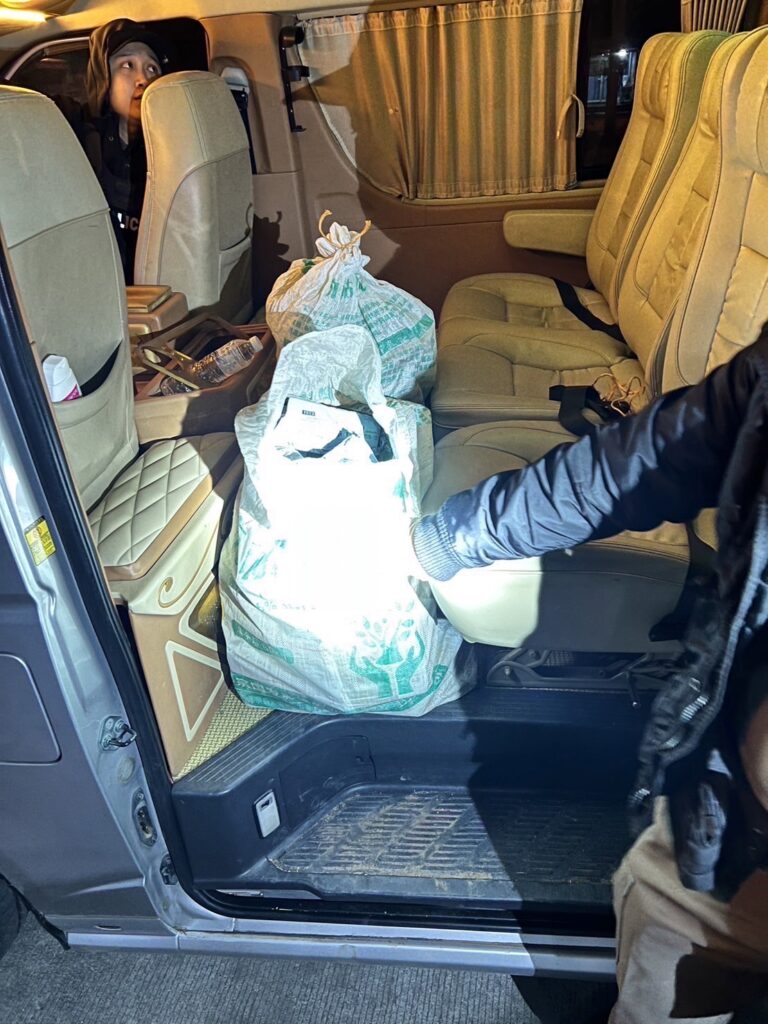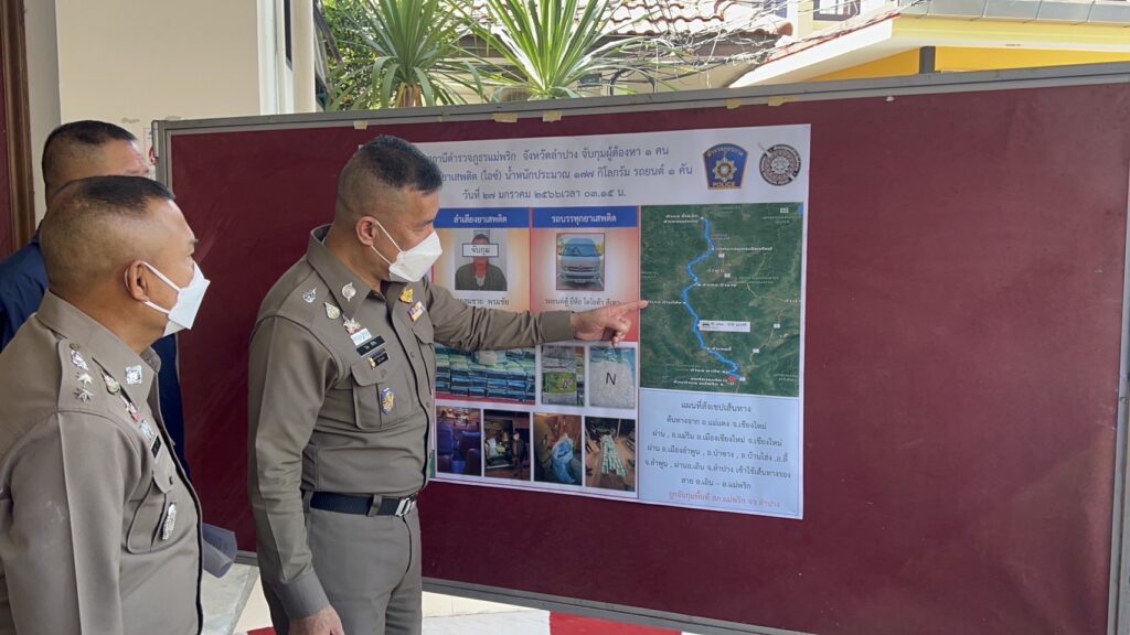 ต่อมาในวันเกิดเหตุ ขณะที่ชุดจับกุมได้ตั้งจุดตรวจ จุดสกัด บริเวณถนนหน้า อบต.แม่พริก ซึ่งเป็นถนนเส้นทางสายรองเพื่อตรวจรถต้องสงสัยที่มักหลบเลี่ยงถนนสายหลักมาใช้ถนนสายรองในการลำเลียงสิ่งของ ผิดกฎหมาย จนกระทั่งเวลา 03.30 น. ได้มีรถยนต์ตู้ยี่ห้อโตโยต้า ทะเบียน ฮอ 19** กทม. ซึ่งตรงกับรถเป้าหมายที่เฝ้าระวัง จึงได้เรียกตรวจ ทราบชื่อผู้ขับขี่ว่านายสมชาย (สงวนนามสกุล) อายุ 48 ปี เป็นชาวกำแพงเพชร และจากการตรวจค้นพบกระสอบปุ๋ยจำนวนหลายใบวางอยู่ภายในรถตู้ระหว่างช่องว่างที่นั่งผู้โดยสาร จึงได้ตรวจสอบสิ่งของที่อยู่ภายในกระสอบปุ๋ย