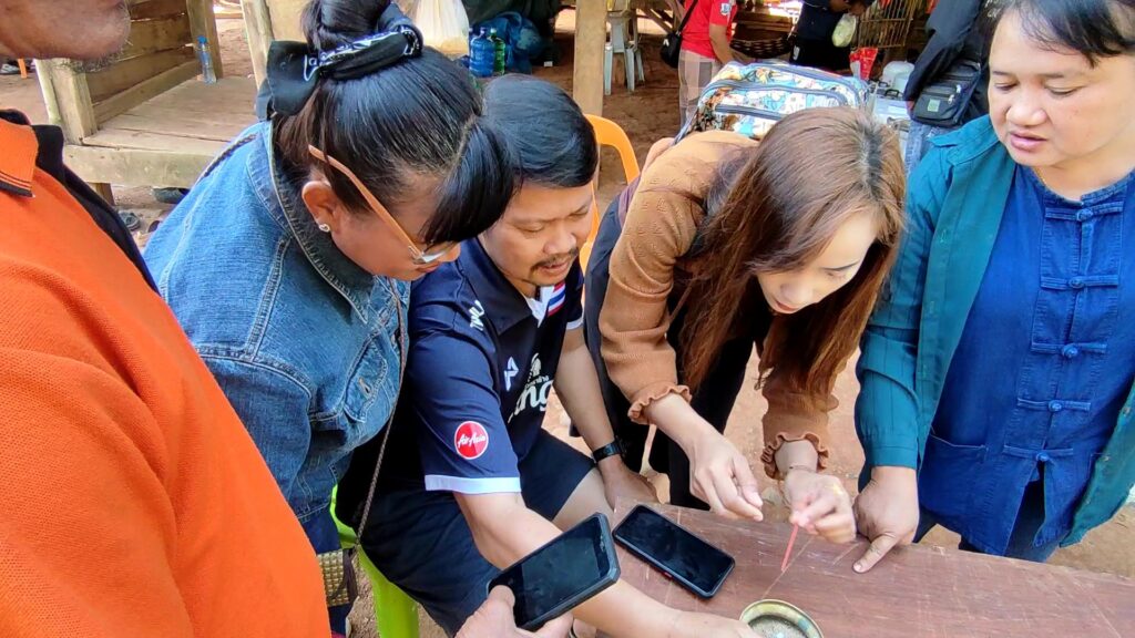 ขณะเดียวกัน หลังเสร็จพิธีทางสงฆ์ ชาวบ้านและเซียนหวย ต่างไม่พลาด พากันส่องดูเลขเด็ดในบาตรน้ำมนต์ หลังน้ำตาเทียน ได้หยดติดกัน ปรากฎเด่นชัด คล้ายตัวเลข 7 3 สร้างความฮือฮาแก่ผู้พบเห็น บางคนก็ถ่ายรูปส่งต่อกันอย่างคึกคัก ส่วนในกระถางธูป ก็เป็นอีกหนึ่งความหวัง เมื่อธูปเสี่ยงทาย ได้ปรากฎตัวเลข 3 7 5 ต่างพากันจดใส่กระดาษ หวังนำไปซื้อเลขเด็ด เสี่ยงโชคเสี่ยงดวง ก่อนวันหวยออก ตามระเบียบต่อไป