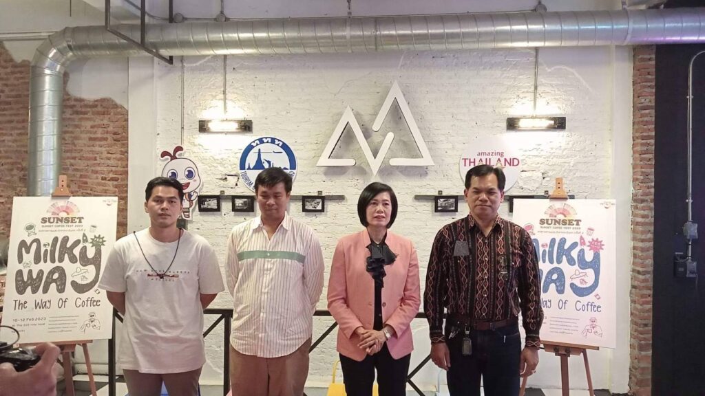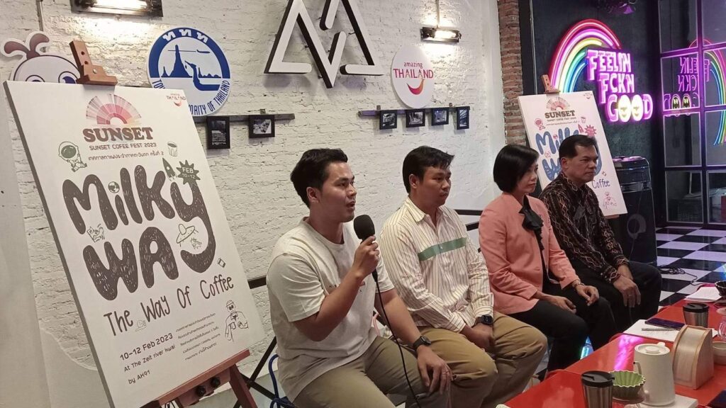 วันที่ 1 กุมภาพันธ์ 2566 ณ ร้าน MAS. Stay-at-Café อ.เมืองกาญจนบุรี นางสาวสรียา บุญมาก ผู้อำนวยการ ททท. สำนักงานกาญจนบุรี นายประสาน ปานคง เกษตรจังหวัดกาญจนบุรี นายมนเทพ โพธิ์งาม เลขากลุ่มกาแฟพิเศษกาญจนบุรี และนายเอกราช ปุณยถิรวาณิชย์ ผู้บริหารร้าน MAS. Stay-at-Café (Winner SANREMO Thailand x BONSOY Latte Art Smackdown 2022) ร่วมกันแถลงข่าวการจัดงาน Sunset Coffee Fest 2023 เทศกาลกาแฟแห่งภาคตะวันตก ครั้งที่ 2 “Milky Way, the Way of Coffee”