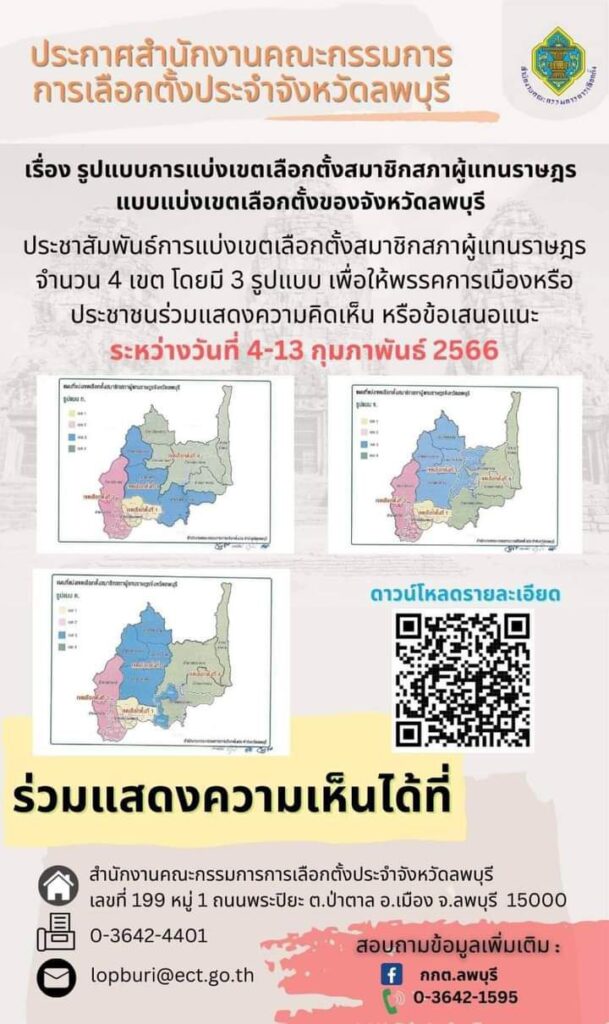 ทั้งนี้ พรรคการเมืองหรือประชาชนผู้ใด มีข้อคิดเห็นหรือข้อเสนอแนะเกี่ยวกับรูปแบบการแบ่งเขตเลือกตั้งสมาชิกสภาผู้แทนราษฏรแบบแบ่งเขตเลือกตั้ง จังหวัดลพบุรี สามารถแสดงความคิดเห็น หรือข้อเสนอแนะต่อผู้อำนวยการการเลือกตั้งประจำจังหวัดลพบุรี โดยส่งความคิดเห็นหรือข้อเสนอแนะเป็นหนังสือไปยังสำนักงานคณะกรรมการการเลือกตั้งประจำจังหวัดลพบุรี เลขที่ 199 หมู่ 1 ถนนพระปิยะ ตำบลป่าตาล อำเภอเมืองจังหวัดลพบุรี หรือทางโทรสารหมายเลข 036-424401 หรือทาง E-mail lopburi@ect.go.th ภายในวันที่ 13 กุมภาพันธ์ 2566