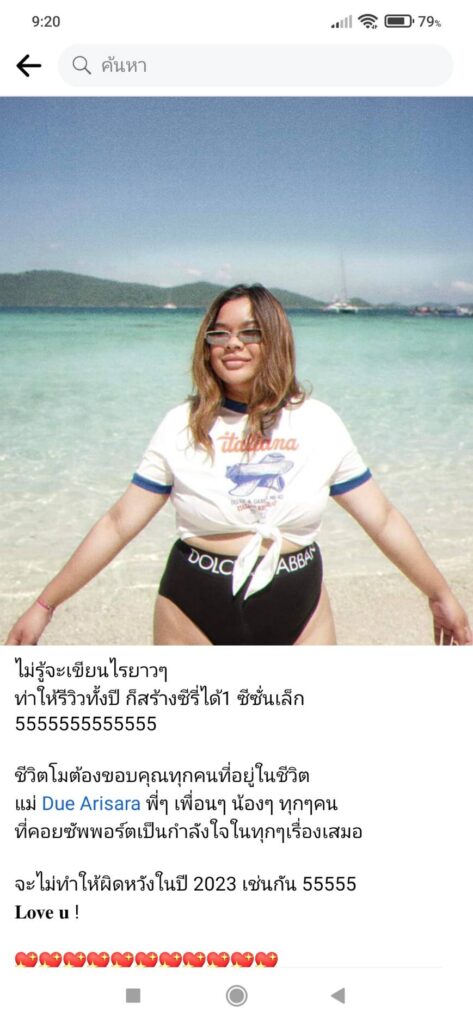 และไม่นานนี้ เพื่อนของดิว อริสรา ที่ชื่อ Tangmo Taneelada จอมแชร์ ที่ได้ออกมาให้กำลังใจ ดิว อริสรา พร้อมกับ พูดว่า “ชีวิตโมต้องขอบคุณทุกคนที่อยู่ในชีวิต
