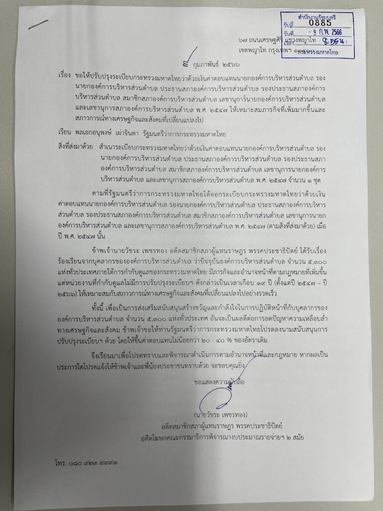 (9 ก.พ.66)ที่กระทรวงมหาดไทย เมื่อเวลา 8.55 น.นายวัชระ เพชรทอง อดีตส.ส.พรรคประชาธิปัตย์ ยื่นหนังสือถึงพล.อ.อนุพงษ์ เผ่าจินดา รัฐมนตรีว่าการกระทรวงมหาดไทย ขอให้ปรับปรุงระเบียบกระทรวงมหาดไทยว่าด้วยเงินค่าตอบแทนนายกองค์การบริหารส่วนตำบล รองนายกองค์การบริหารส่วนตำบล ประธานสภาองค์การบริหารส่วนตำบล รองประธานสภาองค์การบริหารส่วนตำบล สมาชิกสภาองค์การบริหารส่วนตำบล เลขานุการนายกองค์การบริหารส่วนตำบล และเลขานุการสภาองค์การบริหารส่วนตำบล ให้เหมาะสมกับภารกิจที่เพิ่มมากขึ้นและสภาวการณ์ทางเศรษฐกิจและสังคมที่เปลี่ยนแปลงไป