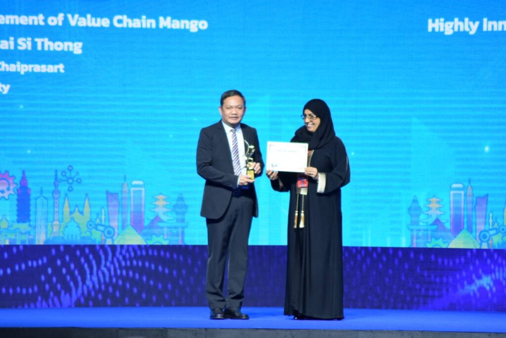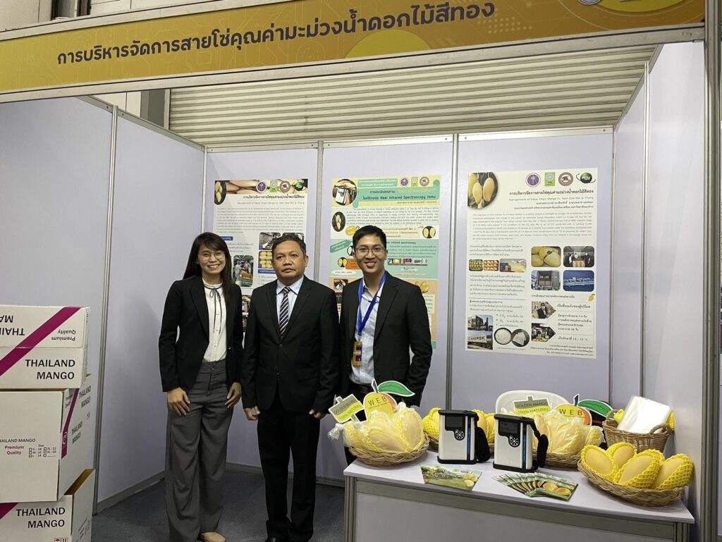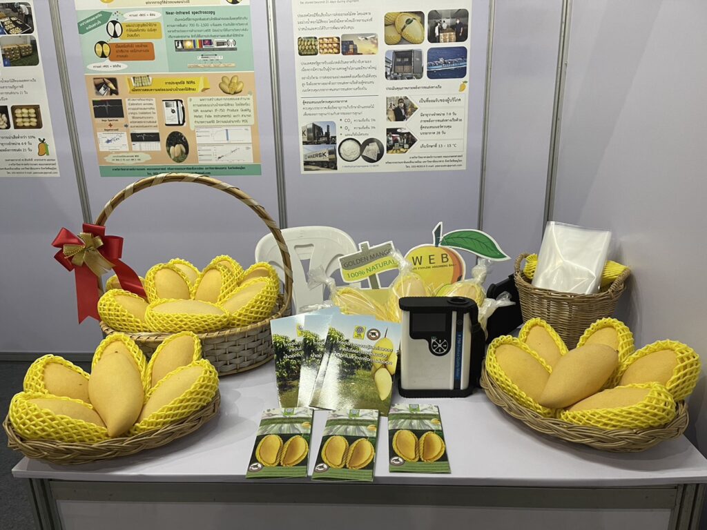 ในช่วงสถานการณ์โควิดที่ผ่านมาผู้ส่งออกผลไม้ไทยต้องประสบปัญหาในการขนส่งสินค้าทางอากาศเป็นอย่างมาก ทีมวิจัยได้ค้นพบแนวทางช่วยเหลือผู้ส่งออกมะม่วงน้ำดอกไม้สีทอง จาก งานวิจัย ที่ (วช.) ให้ทุนในโครงการ การบริหารจัดการสายโซ่คุณค่ามะม่วงน้ำดอกไม้สีทอง ด้วยการประเมินความสุกแก่ของมะม่วงน้ำดอกไม้สีทองโดยใช้เทคนิค เนียร์อินฟราเรดสเปกโตรสโกปีแบบไม่ทำลายผลิตผล สามารถประเมินคุณภาพได้อย่างรวดเร็วถูกต้องมีความแม่นยำสูงและเชื่อถือได้ ในการขนส่งทางเรือใช้ตู้คอนเทนเนอร์ควบคุมบรรยากาศให้มีความเข้มข้นออกซิเจนที่ 3 เปอร์เซนต์และคาร์บอนไดอ๊อกไซด์ที่ 5 เปอร์เซนต์ ร่วมกับสารชะลอความสุกแก่ I-MCP เก็บรักษาที่อุณหภูมิ 13-15 องศาเซลเซียส รวมทั้งใช้บรรจุภัณฑ์ดัดแปลงสภาพบรรยากาศ ได้แก่ถุง White Ethylene absorbing Bag ห่อมะม่วงน้ำดอกไม้ ทำการส่งไปที่เมืองดูไบ สหรัฐอาหรับเอมิเรตส์ ใช้เวลาขนส่ง 28 วัน มีระยะเวลาจำหน่ายอีก 7-9 วัน