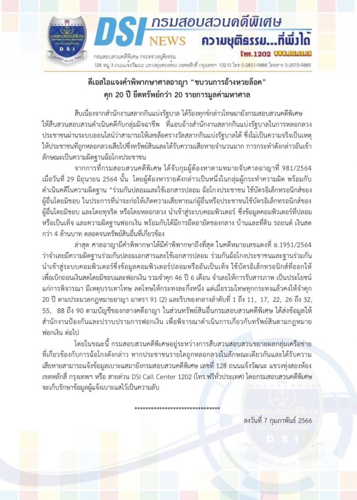 สืบเนื่องมาจากสำนักงานสลากกินแบ่งรัฐบาล ได้ร้องทุกข์กล่าวโทษมายังกรมสอบสวนคดีพิเศษ ให้สืบสวนสอบสวนดำเนินคดีกับกลุ่มมิจฉาชีพ ที่แอบอ้างสำนักงานสลากกินแบ่งรัฐบาลในการหลอกลวงประชาชนผ่านระบบออนไลน์ว่าสามารถให้เลขล็อครางวัลสลากกินแบ่งรัฐบาลได้ ซึ่งไม่เป็นความจริงเป็นเหตุให้ประชาชนที่ถูกหลอกลวงเสียไปซึ่งทรัพย์สินและได้รับความเสียหายจำนวนมาก การกระทำดังกล่าวอันเข้าลักษณะเป็นความผิดฐานฉ้อโกงประชาชน