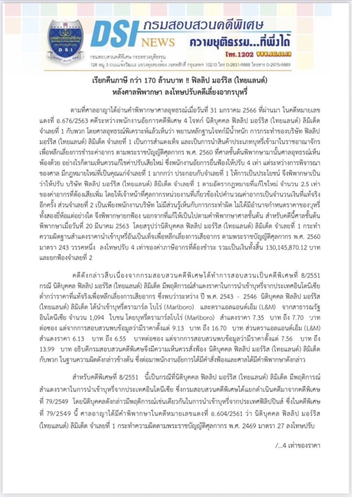 ตามที่ศาลอาญาได้อ่านคำพิพากษาศาลอุทธรณ์เมื่อวันที่ 31 มกราคม 2566 ที่ผ่านมา ในคดีหมายเลขแดงที่ อ.676/2563 คดีระหว่างพนักงานอัยการคดีพิเศษ 4 โจทก์ นิติบุคคล ฟิลลิป มอร์ริส (ไทยแลนด์) ลิมิเต็ด