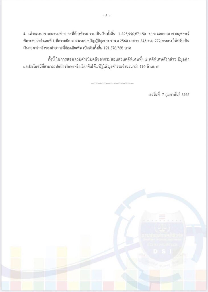 ทั้งนี้ ในการสอบสวนดำเนินคดีของกรมสอบสวนคดีพิเศษทั้ง 2 คดีพิเศษดังกล่าว มีมูลค่าผลประโยชน์ที่สามารถปกป้องรักษาหรือเรียกคืนให้แก่รัฐได้ มูลค่ารวมจำนวนกว่า 170 ล้านบาท