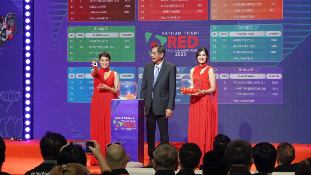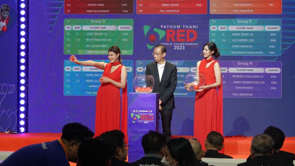 เมื่อเวลา 14.00 น. วันที่ 11 กุมภาพันธ์ 2566 ที่ลานสปอร์ตไลท์ ชั้น G ศูนย์การค้าฟิวเจอร์พาร์ค และสเปลล์ ตำบลประชาธิปัตย์ อำเภอธัญบรี จังหวัดปทุมธานี นายณรงค์ศักดิ์ โอสถธนากร ผู้ว่าราชการจังหวัดปทุมธานี เป็นประธานงานแถลงข่าวและจับฉลากแบ่งสายการแข่งขันปทุมธานี 6 แดง ชิงแชมป์โลก 2023 ” Pathum Thani 6 Red World Championship 2023″ ชิงถ้วยพระราชทาน พระบาทสมเด็จพระปรเมนทรรามาธิบดีศรีสินทรมหาวชิราลงกรณ พระวชิรเกล้าเจ้าอยู่หัว โดยมี พล.ต.ท.คำรณวิทย์ ธูปกระจ่าง นายกองค์การบริหารส่วนจังหวัดปทุมธานี , ร้อยตำรวจเอก ดร.ตรีลุพธ์ ธูปกระจ่าง นายกเทศมนตรีนครรังสิต พร้อมด้วย นายสุนทร จารุมนต์ นายกสมาคมกีฬาบิลเลียดแห่งประเทศไทย, ผู้แทนจากการกีฬาแห่งประเทศไทย และ นายวินิจ เลิศรัตนชัย ประธานเจ้าหน้าที่บริหาร บริษัท เฟรชแอร์ เฟสติวัล จำกัด ร่วมพิธีการ