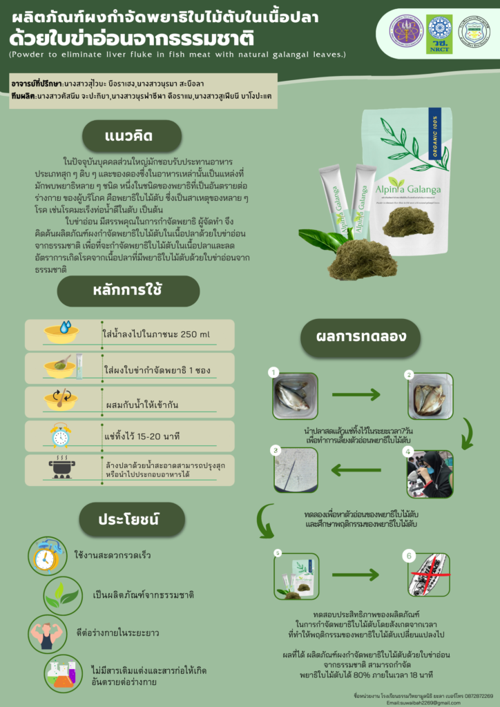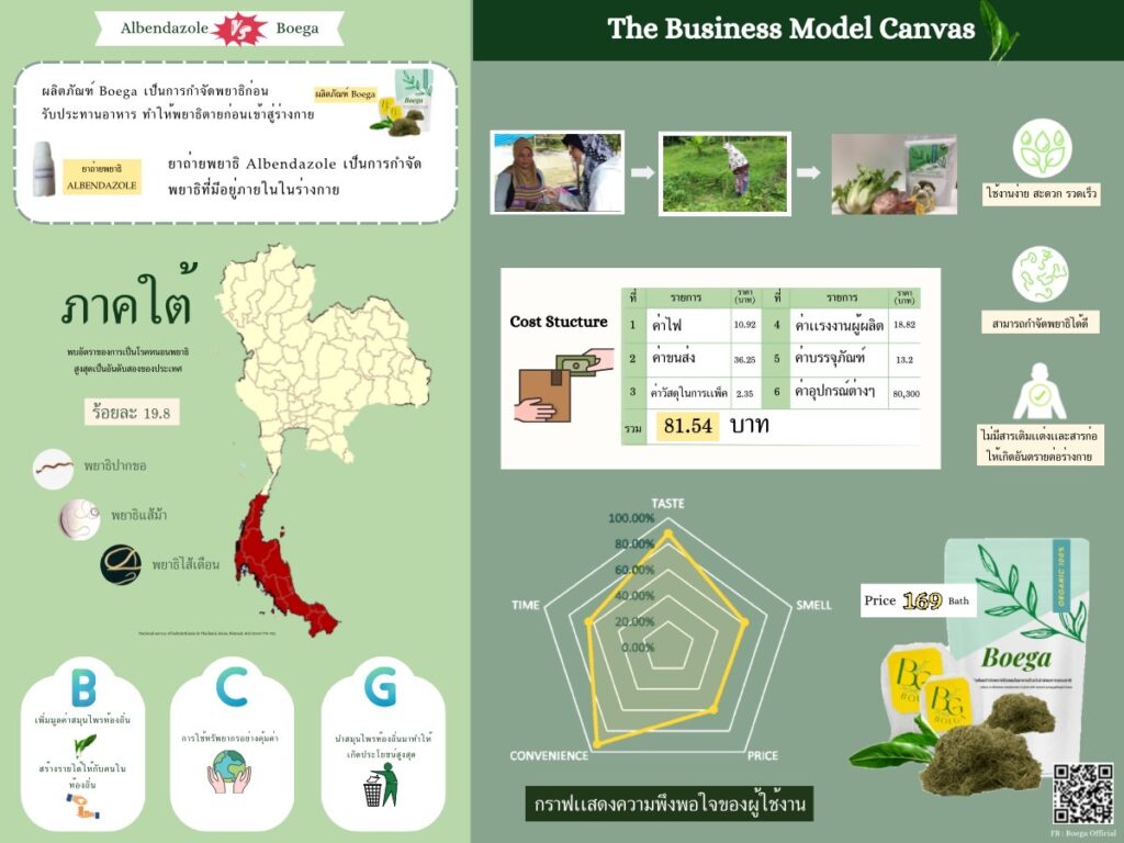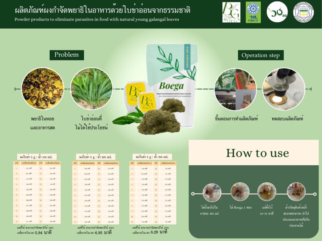 นางสาวตัสนีม จะปะกิยา ตัวแทนทีมนักประดิษฐ์ กล่าวว่า ในปัจจุบัน บุคคลส่วนใหญ่มักชอบรับประทานอาหารประเภทสุกๆ ดิบๆ และของดอง โดยในอาหารเหล่านี้เป็นแหล่งที่มักพบพยาธิหลากหลายชนิด และยังเป็นสาเหตุของหลายๆโรค อีกทั้ง “ใบข่า” เป็นส่วนที่ไม่ได้ถูกนำมาใช้ประโยชน์ทางการเกษตร ซึ่งใบข่าอ่อนมีสรรพคุณในการกำจัดพยาธิ ทางคณะผู้ประดิษฐ์จึงคิดค้นผลิตภัณฑ์ผงกำจัดพยาธิในอาหารจากใบข่าอ่อนธรรมชาติ จากการทดสอบผงใบข่า 5 กรัมต่อน้ำ 100 มิลลิลิตร พบว่าสามารถกำจัดพยาธิได้ดีที่สุดภายในเวลาเฉลี่ย 5.94 นาทีเท่านั้น วิธีการใช้ผลิตภัณฑ์นี้ก็สามารถใช้ได้โดยง่าย เพียงแค่ใส่น้ำ และผง Boega ลงในภาชนะที่เตรียมไว้ จากนั้นนำอาหารสดมาแช่ทิ้งไว้ประมาณ 15–20 นาที แล้วล้างออกด้วยน้ำสะอาด เพียงเท่านี้ก็สามารถนำวัตถุดิบไปประกอบอาหาร หรือรับประทานได้ตามปกติ ซึ่งผลิตภัณฑ์ Boega สามารถกำจัดพยาธิได้อย่างสะดวก รวดเร็ว และไม่มีสารตกค้าง และสารก่ออันตรายต่อร่างกาย อีกทั้งยังเป็นมิตรต่อสิ่งแวดล้อม ปัจจุบันผลิตภัณฑ์ดังกล่าวกำลังอยู่ในขั้นตอนการขอจดสิทธิบัตร