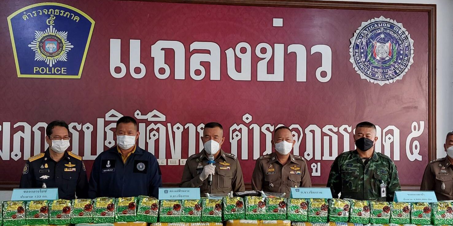 วันที่ 13 กุมภาพันธ์ 2566 เวลา 09.00 น. ตำรวจภูธรภาค 5 โดย พล.ต.ท.ปิยะ ต๊ะวิชัย ผบช.ภ.5 , พล.ต.ต. พฤทธิพงษ์ ประยูรศิริ รอง ผบช.ภ.5 ,พล.ต.ต.วรพงค์ คำลือ ผบก.สส.ภ.5 ,พ.ต.อ.พิทักษ์ นาสมวาส รอง ผบก.สส.ภ.5 ,พ.ต.อ.สงกรานต์ สันติวงค์ ผกก.สภ.แม่ฟ้าหลวง ,พ.ต.อ.พัสกร ธวัชเชียงกุล ผกก.สส.ภ.จว.เชียงราย ,นายอนุเทพ ธาระณะ ผอ.ส่วนตรวจสอบทรัพย์สิน ปปส.ภ.5,พ.อ.ยอดชาย พวงวรินทร์ รอง เสธ ศอ.ปส.ชน. ได้ร่วมกันแถลงผลการจับกุมยาเสพติดรายสำคัญ จำนวน 1 คดี จับกุมผู้กระทำความผิดตามหมายจับ 1 คน ตรวจยึด ยาบ้า 4.6 ล้านเม็ด ยาไอซ์ 133 กิโลกรัม ขยายผลตรวจยึดรถยนต์ของกลางรวม 4 คัน ซึ่งเป็นผลการจับกุมของเจ้าหน้าที่ตำรวจ สภ.แม่ฟ้าหลวง จว.เชียงราย