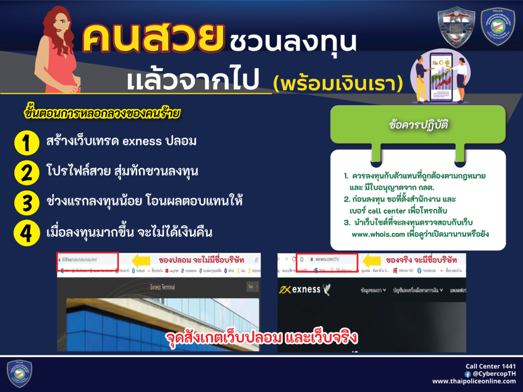 วันที่ 14 กุมภาพันธ์ 2566 : พล.ต.อ.รอย อิงคไพโรจน์ รองผู้บัญชาการตำรวจแห่งชาติ (รอง ผบ.ตร.),พล.ต.ท.สมพงษ์ ชิงดวง ผู้ช่วยผู้บัญชาการตำรวจแห่งชาติ (ผู้ช่วย ผบ.ตร.) หัวหน้าอำนวยการด้านประชาสัมพันธ์ ศูนย์ปราบปรามอาชญากรรมทางเทคโนโลยีสารสนเทศ (ศปอส.ตร.),พล.ต.ต.ทินกร รังมาตย์ รอง ผบช.สพฐ./หัวหน้าด้านข่าวสารและประชาสัมพันธ์,พล.ต.ต.อรุษ แสงจันทร์ รอง ผบช.ศปก.ตร./หัวหน้าฝ่ายแถลงข่าวและประสานงานสื่อมวลชน ศปอส.ตร., พล.ต.ต.ชูศักดิ์ ขนาดนิด ผบก.ฯ ปฏิบัติหน้าที่ ศปอส.ตร. และ พ.ต.อ.ภัคพงศ์ สายอุบล รอง ผบก./รองหัวหน้าฝ่ายแถลงข่าวและประสานงานสื่อมวลชน ร่วมกันเปิดเผยว่า ขณะนี้มีกลุ่มมิจฉาชีพหลอกลวงประชาชนหลายรูปแบบ ล่าสุดในช่วงเทศาลวาเลนไทน์จะมีการหลอกลวงในลักษณะโรแมนซ์สแกม ซึ่ง ศปอส.ตร. และ บช.สอท. ขอเตือนภัยให้กับประชาชน โดยเฉพาะการ “หลอกเป็นสาวสวย ชักชวนลงทุนกับเว็บปลอม exness”