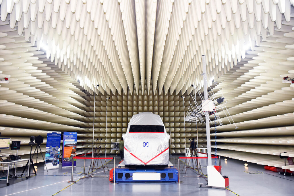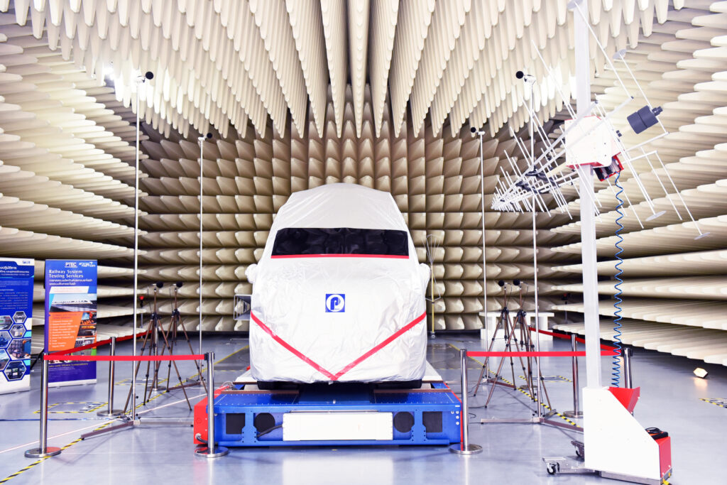 นอกจากการทดสอบผลิตภัณฑ์ของระบบรางในห้องปฏิบัติการทดสอบแล้ว PTEC ยังมีประสบการณ์ในการทดสอบการรบกวนทางแม่เหล็กไฟฟ้า (Electromagnetic Compatibility : EMC) สำหรับรถไฟมาแล้วมากกว่า 20 ปี โดยเริ่มดำเนินงานตั้งแต่การสำรวจการรบกวนแม่เหล็กไฟฟ้าของระบบควบคุมและโทรคมนาคมตลอดเส้นแนวราง ที่พาดผ่านสถานที่ต่างๆ เช่น โรงพยาบาล เสาโทรคมนาคม เสาวิทยุโทรทัศน์ ธนาคาร ระบบสัญญาณไฟจราจรบนถนน ซึ่งสถานที่ต่างๆนี้ มีความเสี่ยงในการรบกวนสัญญาณควบคุมของระบบรถไฟด้วย โดยที่ผ่านมา PTEC ได้ดำเนินการทดสอบสำหรับรถไฟหลายเส้นทางแล้ว เช่น สายสีม่วง สายสีเขียว สายสีน้ำเงิน สายสีแดง สายสีทอง รวมถึงรถไฟฟ้า BTS อีกด้วย