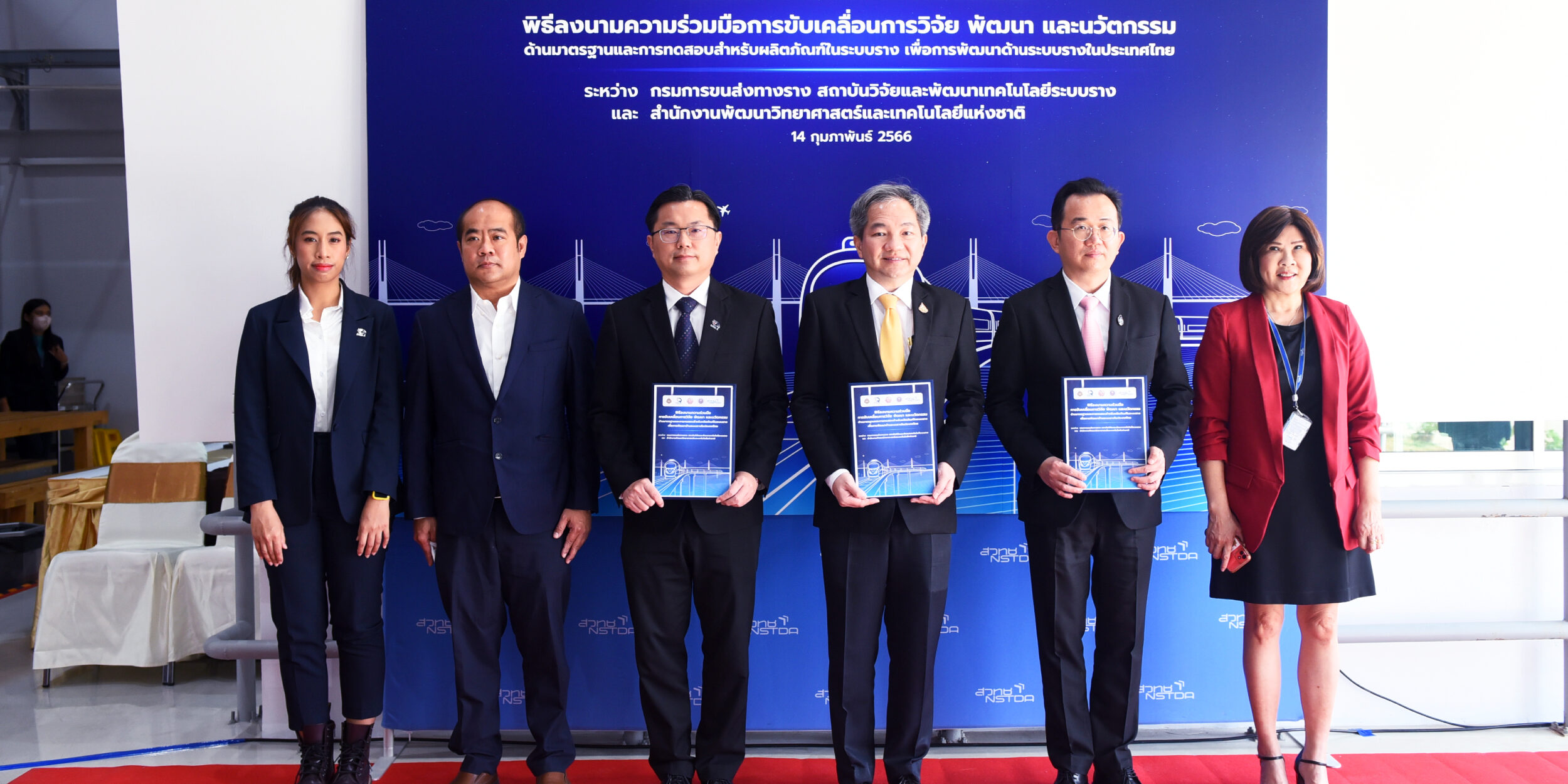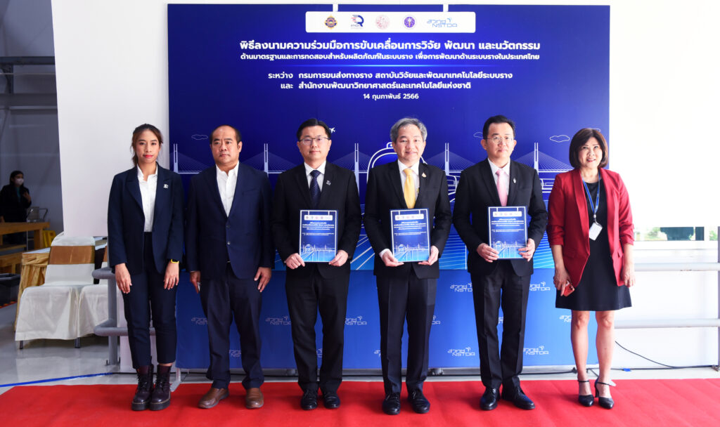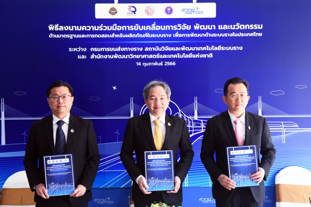 วันที่ 14 กุมภาพันธ์ 2566 : ศาสตราจารย์ ดร.ชูกิจ ลิมปิจำนงค์ ผู้อำนวยการสำนักงานพัฒนาวิทยาศาสตร์และเทคโนโลยีแห่งชาติ (สวทช.) กระทรวงการอุดมศึกษา วิทยาศาสตร์ วิจัยและนวัตกรรม (อว.),ดร.พิเชฐ คุณาธรรมรักษ์ อธิบดีกรมการขนส่งทางราง (ขร.) และ ดร.สันติ เจริญพรพัฒนา ผู้อำนวยการสถาบันวิจัยและพัฒนาเทคโนโลยีระบบราง (องค์การมหาชน) หรือ (สทร.) กระทรวงคมนาคม ร่วมลงนามความร่วมมือการขับเคลื่อนการวิจัยพัฒนา นวัตกรรมด้านมาตรฐานและการทดสอบ สำหรับผลิตภัณฑ์ในระบบราง เพื่อการยกระดับผลิตภัณฑ์ให้สอดคล้องกับการพัฒนาด้านระบบรางในประเทศไทย ที่อาคารแชมเบอร์ 10 เมตร อุทยานวิทยาศาสตร์ประเทศไทย จ.ปทุมธานี