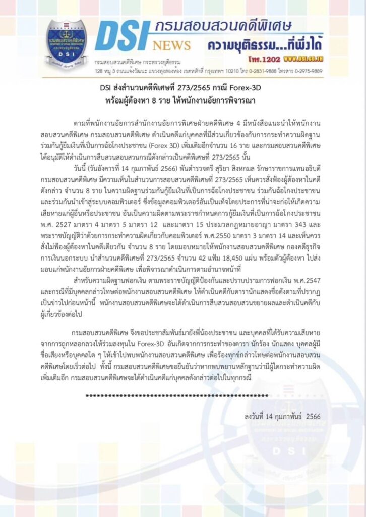 ตามที่พนักงานอัยการสำนักงานอัยการพิเศษฝ่ายคดีพิเศษ 4 มีหนังสือแนะนำให้พนักงานสอบสวนคดีพิเศษ กรมสอบสวนคดีพิเศษ ดำเนินคดีแก่บุคคลที่มีส่วนเกี่ยวข้องกับการกระทำความผิดฐานร่วมกันกู้ยืมเงินที่เป็นการฉ้อโกงประชาชน (Forex 3D) เพิ่มเติมอีกจำนวน 16 ราย และกรมสอบสวนคดีพิเศษ ได้อนุมัติให้ดำเนินการสืบสวนสอบสวนกรณีดังกล่าวเป็นคดีพิเศษที่ 273/2565 นั้น