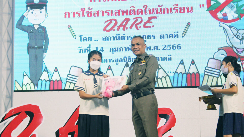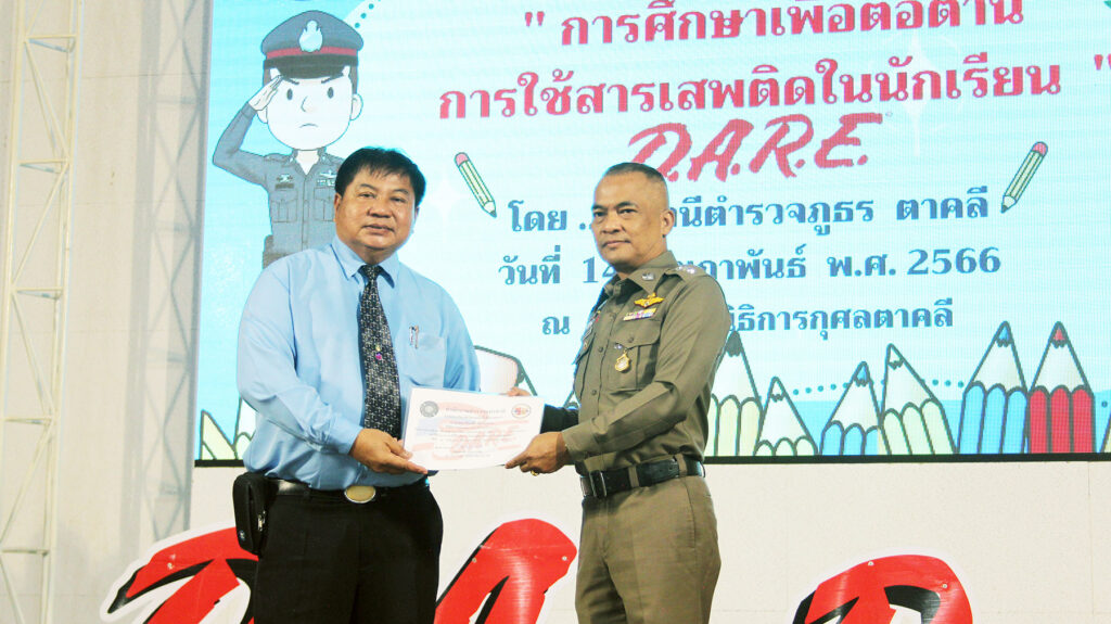 ซึ่งสถานีตำรวจภูธรตาคลี ได้จัดพิธีมอบประกาศนียบัตรและปิดโครงการการศึกษาเพื่อต่อต้านการใช้ยาเสพติดในเด็กนักเรียนขึ้นในวันนี้ เพื่อเป็นกำลังใจให้กับครูตำรวจแดร์ และนักเรียนที่รับประกาศนียบัตรตลอดจนมีการบูรณาการความร่วมมือของทุกฝ่าย ให้เล็งเห็นถึงความสำคัญที่จะร่วมกันในการแก้ไขปัญหายาเสพติดในสถานศึกษา ได้อย่างมีประสิทธิภาพในการดำเนินโครงการการศึกษาเพื่อต่อต้านการใช้ยาเสพติดในเด็กนักเรียนในภาคเรียนนี้ได้สำเร็จลุล่วงเป็นไปตามวัตถุประสงค์ของโครงการเป็นอย่างดี