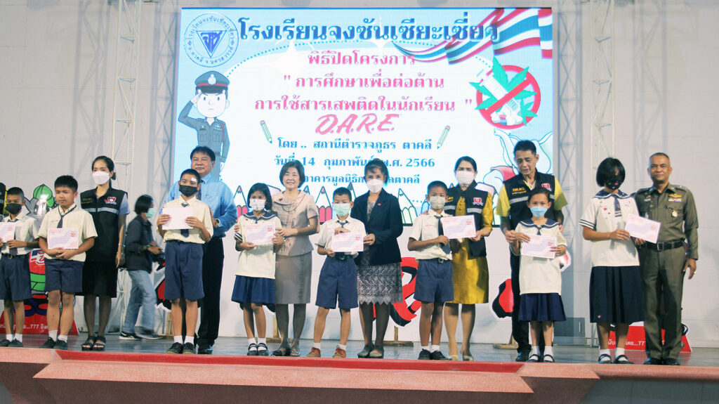 โดยมี ร.ต.ต.ธวัช อิ่มคำ กล่าวรายงาน การศึกษาเพื่อต่อต้านการใช้ยาเสพติดในเด็กนักเรียนของโรงเรียนจงซันเซียะเซี่ยว ตามที่รัฐบาลได้กำหนดให้มีการแก้ไขปัญหายาเสพติดเป็นวาระแห่งชาติ โดยใช้ยุทธศาสตร์พลังแผ่นดินเอาชนะยาเสพติดให้แก่นักเรียนชั้นประถมศึกษาปีที่ 5 และ 6 เป็นกลุ่มเป้าหมายแรกโดยแผนงานการสร้างภูมิคุ้มกัน และป้องกันยาเสพติดได้กำหนดให้ ครูตำรวจแดร์ เข้าร่วมดำเนินการป้องกันยาเสพติดในชั้นเรียนโดยให้ความรู้การป้องกันยาเสพติด