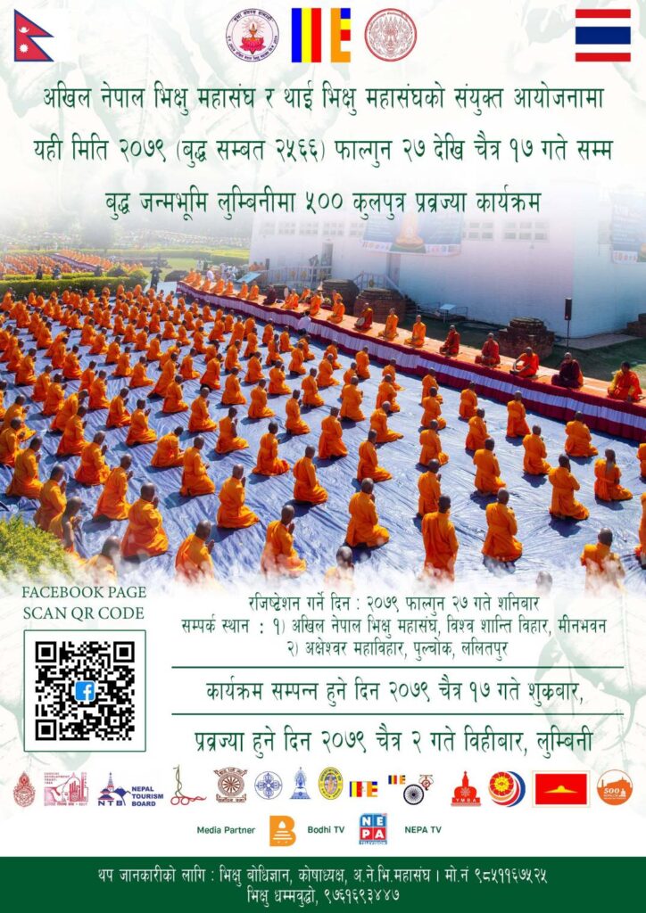 สำหรับโครงการบรรพชา 500 รูป ประเทศเนปาล ถวายเป็นพุทธบูชา จัดขึ้นโดยความมือระหว่างองค์กรพุทธไทย และเนปาล ประกอบด้วย 1.Lumbini Development trust คณะกรรมการพัฒนาลุมพินี ประเทศเนปาล 2.Nepal Tourism Board การท่องเที่ยวประเทศเนปาล 3.Lalitpur Metropolitan เทศบาลเมือง ลลิตปูร์ ประเทศเนปาล 4.Boudha Bihar Sangha สมาคมวัดพุทธ ประเทศเนปาล 5. Dhammakaya Temple and Dhammakaya Foundation วัดพระธรรมกาย และมูลนิธิธรรมกาย ประเทศไทย 6.World Alliance Of Buddhist องค์การพุทธโลก (WAB) 7.Youn Man Buddhist Association ยุวพุทธสมาคมประเทศเนปาล YMBA 8.Aksheswar Mahabihar วัดอเชสวน ประเทศเนปาล 9.Golden Tample วัดทอง 10. Dharmodaya Sabha ธรรมสภาของ เถรวาท ของมหายาน และ วัชรยาน 11.Dharmasakchchha Sangha ชมรม ธรรมสังกัจฉา 12.Nepal Magar Boudha Service Society สมาคมพุทธชาวมะกัน 13.Metta volunteers ชมรมอาสาสมัครเมตตา 14.Nagbahal Tol Sudhar Samiti วัดนาคบาฮาล 15.Boudha Yuwa Kamiti สมาคมเยาวชนพุทธ และ Media partner 2 แห่ง 1.Nepa TV และ 2.Boddhi TV