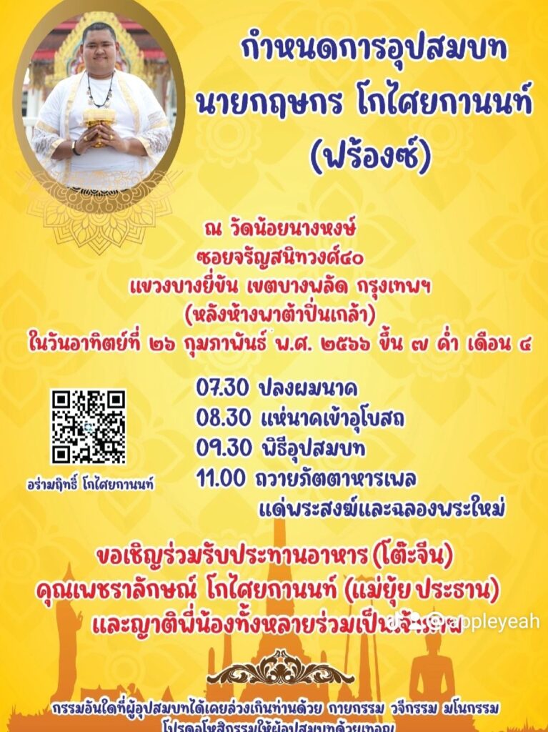 ท่านใดไม่ติดภาระกิจอันใดขอเชิญเพื่อนพ้องน้องพี่ทุกท่าน “เนื่องในงานอุปสมบท” นายกฤษกร โกไศยกานนท์