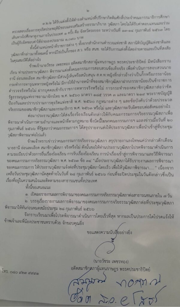 ( 22 ก.พ.66)เมื่อเวลา 10.02 น.ที่อาคารรัฐสภา นายวัชระ เพชรทอง อดีตส.ส.พรรคประชาธิปัตย์และนายสมบูรณ์ ทองบุราณ อดีตสว.ยโสธร ยื่นหนังสือถึงนายพรเพชร วิชิตชลชัย ประธานวุฒิสภา กรณีประชาชนและสังคมข้องใจคณะกรรมการจริยธรรมวุฒิสภาเสนอลงโทษเพียงแค่ตักเตือนนายธานี อ่อนละเอียด จากเรื่องกิ๊ก สว. จริงหรือไม่ จึงขอเรียกร้องให้วุฒิสภาเร่งบรรจุวาระการประชุมให้ทันสมัยประชุมภายในวันที่ 28 กุมภาพันธ์นี้ อย่าได้ประวิงเวลาและปกป้องพวกเดียวกัน