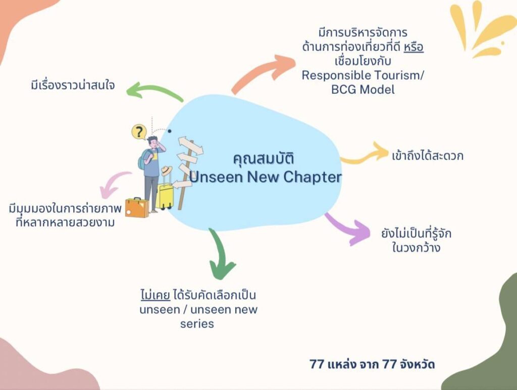 ททท. ได้กำหนดจัดทำโครงการ Unseen New Chapter ภายใต้กลยุทธ์กระตุ้นการเดินทาง และการใช้จ่ายของกลุ่มนักท่องเที่ยวคุณภาพ โดยการคัดเลือกแหล่งท่องเที่ยวที่มีความสวยงามและมีการบริหารจัดการด้านการท่องเที่ยวที่ดี แต่ยังไม่เป็นที่รู้จักในวงกว้าง และมีคุณสมบัติตามที่กำหนด จังหวัดละ 1 แห่ง รวมทั้งสิ้น 77 แห่ง จาก 77 จังหวัด