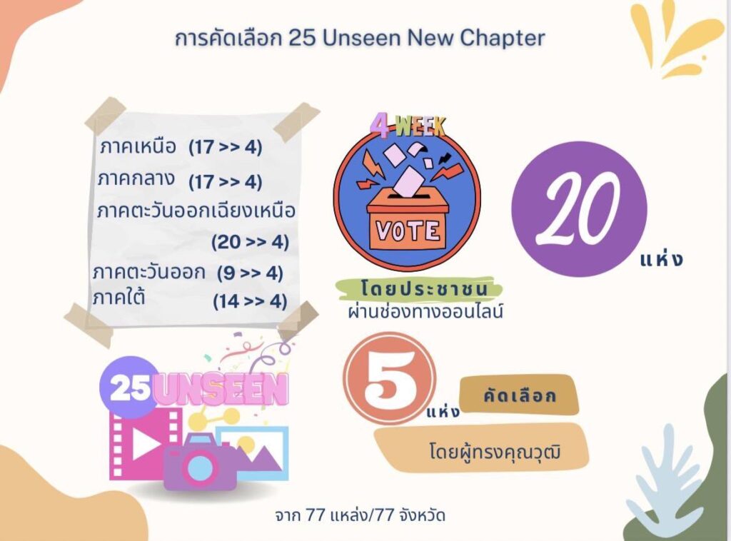 โดยมีเงื่อนไขในการส่งแหล่งท่องเที่ยว กำหนดให้ 1 จังหวัด ส่งได้ 1 แหล่งท่องเที่ยว เมื่อได้ชื่อ 1 แหล่งท่องเที่ยว ททท.ส่วนกลาง จะรวบรวมแหล่งท่องเที่ยวทั้งหมด จากนั้น ททท.จะเปิดให้นักท่องเที่ยว สาธารณชน ประชาชน มีส่วนร่วมในการโหวตผ่านช่องทางออนไลน์ ในวงกว้าง ทั้ง 77 แหล่งท่องเที่ยว จะเหลือเพียง 20 แหล่งท่องเที่ยว และอีก 5 แหล่งท่องเที่ยวจะขอสงวนสิทธิ์คัดเลือก โดย ผู้ทรงคุณวุฒิ รวมทั้งหมดเป็น “25 Unseen New Chapters” ส่วนแหล่งท่องเที่ยวที่เหลือ ที่ไม่ได้รับการโหวต 52 แหล่งท่องเที่ยว ททท. ยังให้ความสำคัญและจะเผยแพร่ประชาสัมพันธ์ทางการตลาดต่อไป