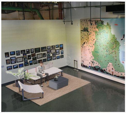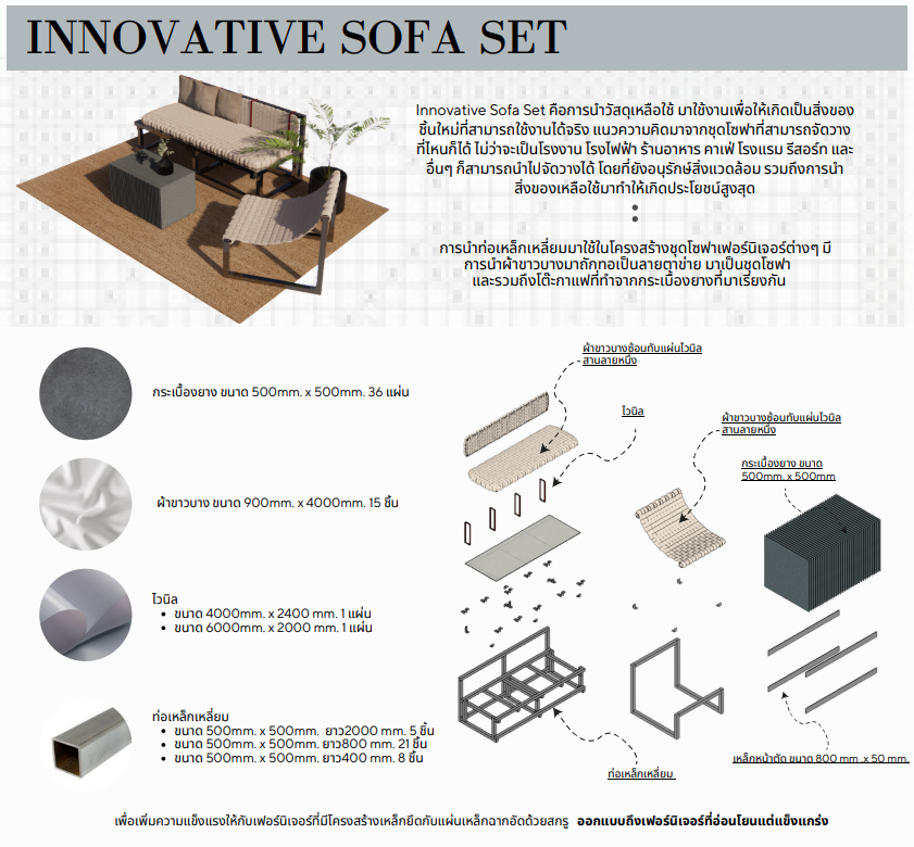 นายฐานันดร แซ่ตั้ง กล่าวถึงแนวคิดในการออกแบบชิ้นงาน “INNOVATIVE SOFA SET” ว่า เกิดจากการนำโครงสร้าง และวัสดุเหลือใช้ภายในพื้นที่นิทรรศการงานนวัตกรรม วิทย์พลิกโลก สัปดาห์วิทยาศาสตร์ศูนย์การเรียนรู้ โรงไฟฟ้าขนอม ประจำปี 2565 นำมาใช้ออกแบบเฟอร์นิเจอร์เพื่อการใช้งาน โดยได้นำเอาท่อเหล็กเหลี่ยมมาใช้ในการสร้างชุดโซฟา โต๊ะกาแฟที่นำวัสดุเหลือใช้เช่นกระเบื้องยาง และแผ่นเหล็กโครง รวมถึงการนำผ้าขาวบาง และไวนิลมาเย็บติดกับผ้า และนำมาสาน คุณสมบัติของวัสดุมีการยืดหยุ่นตามการใช้งาน เพื่อเป็นจุดพักคอยระหว่างโซนนิทรรศการของศูนย์การเรียนรู้โรงไฟฟ้าขนอม