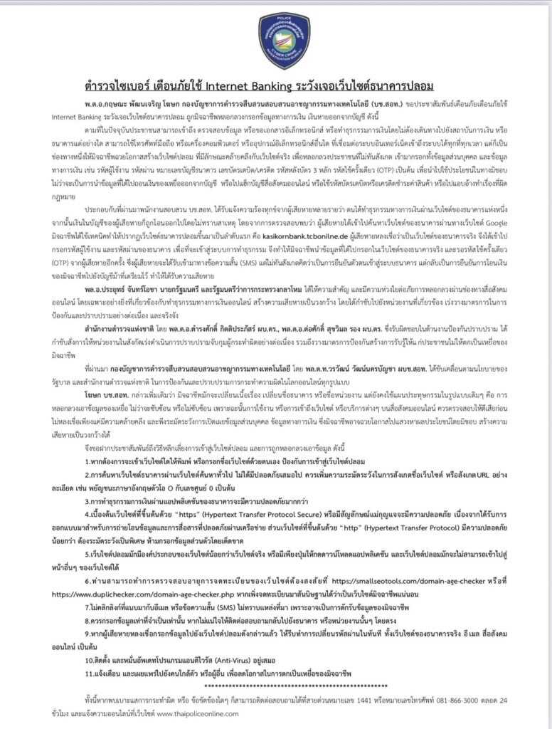 พ.ต.อ.กฤษณะ พัฒนเจริญ โฆษก กองบัญชาการตำรวจสืบสวนสอบสวนอาชญากรรมทางเทคโนโลยี (บช.สอท.) ขอประชาสัมพันธ์เตือนภัยเตือนภัยใช้ Internet Banking ระวังเจอเว็บไซต์ธนาคารปลอม ถูกมิจฉาชีพหลอกลวงกรอกข้อมูลทางการเงิน เงินหายออกจากบัญชี ดังนี้