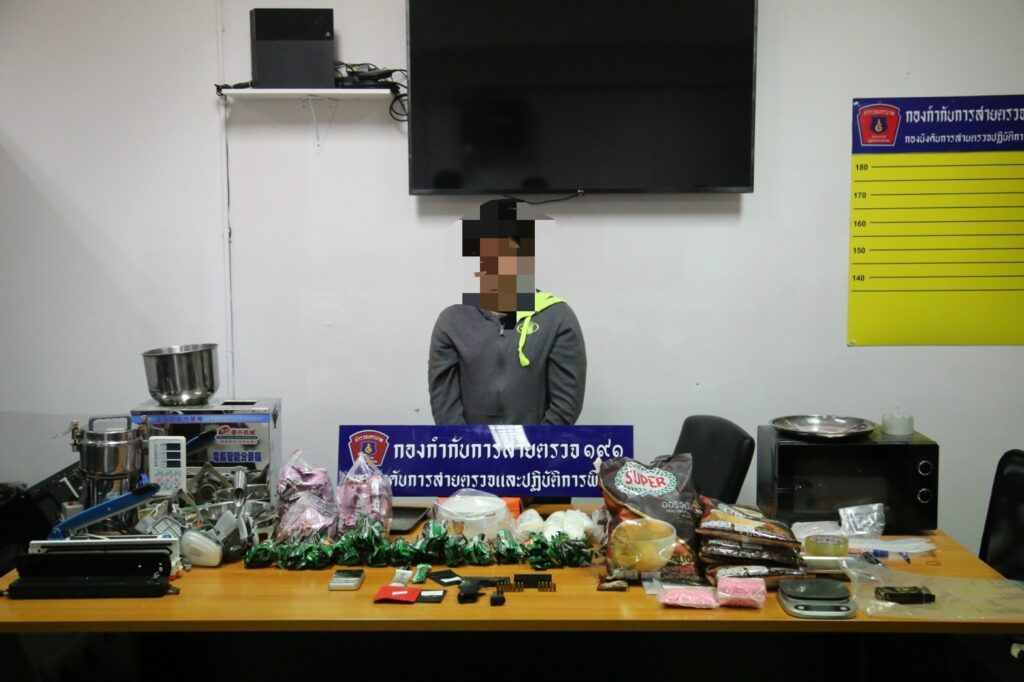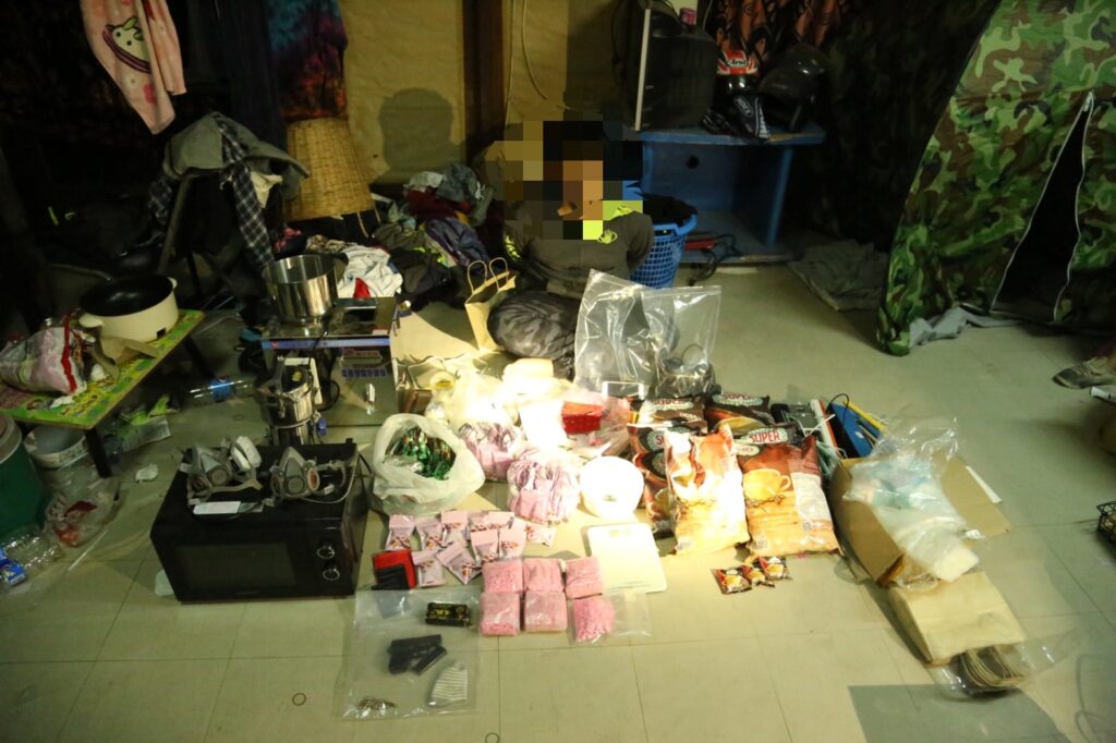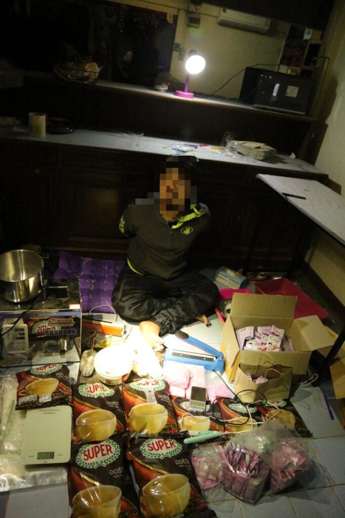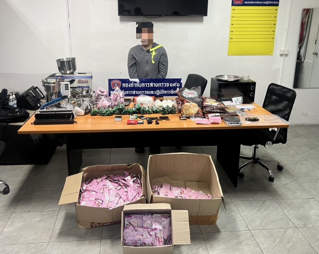 จ้าหน้าที่ตำรวจ บก.สปพ. ชุดจับกุม สืบสวนขยายผล เข้าตรวจค้นและจับกุมผู้ต้องหา 1 ราย พร้อมของกลาง แขวงคลองเจ้าคุณสิงห์ เขตวังทองหลาง กรุงเทพฯ จับกุมผู้ต้องหา จำนวน 1 ราย คือนายชณาธิป หรือตุ้ย สงวนนามสกุล อายุ 32 ปี พร้อมด้วยของกลาง ยาเสพติดให้โทษประเภท1 (ยาอี) รวมจำนวนประมาณ 5,000 เม็ด,วัตถุออกฤทธิ์ต่อจิตและประสาทประเภท 2 (เคตามีน) รวมน้ำหนักประมาณ 700 กรัม,วัตถุออกฤทธิ์ต่อจิตและประสาทประเภท2 (เคตามีน) ผสม ผงกาแฟสำเร็จรูป ประมาณ 600 ซอง ,วัตถุออกฤทธิ์ต่อจิตและประสาทประเภท2 (เคตามีน) ผสม ผงคอลลาเจน ประมาณ 120 ซอง,เครื่องปั่นผงละเอียด,เครื่องซีลสูญญากาศ,เครื่องชั่งตวง ดิจิตอล,ตาชั่ง ดิจิตอล และอุปกรณ์แบ่งบรรจุจำนวนมาก,ผงคอลลาเจน สำเร็จรูป และซองเปล่าคอลลาเจน เพื่อเตรียมนำมาผสมกับเคตามีน จำนวนมาก,อาวุธปืนสั้น ขนาด 6.35 จำนวน 1 กระบอก พร้อมเครื่องกระสุน จำนวน 13 นัด,โทรศัพท์มือถือ จำนวน 2 เครื่อง,รถยนต์ จำนวน 1 คัน,เงินสด จำนวน 180,000 บาท และทรัพย์สินจำนวนหลายรายการ