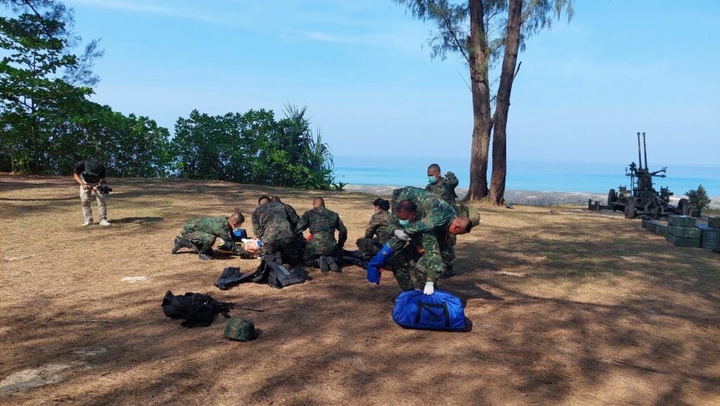 วันนี้ 24 กุมภาพันธ์ 2566 เมื่อวันที่ 23 กุมภาพันธ์ 2566 ที่ผ่านมานาวาเอก ศุภสิทธิ์ บูรณะโอสถ รองผู้บัญชาการหน่วยบัญชาการต่อสู้อากาศยานและรักษาฝั่ง รักษาราชการผู้บัญชาการหน่วยบัญชาการต่อสู้อากาศยานและรักษาฝั่ง กองทัพเรือพร้อมคณะผู้บังคับบัญชาเดินทางมาตรวจเยี่ยมการฝึกยิงอาวุธทางยุทธวิธีฝั่งทะเลอันดามันประจำปี 2566 ณ สนามฝึกยิงอาวุธ ทร. ทางด้านฝั่งทะเลอันดามัน สนามที่ 3 (สนาม c) อำเภอท้ายเหมือง จังหวัดพังงา โดยมี นาวาเอก เฉลิมพร คล้ายทอง ผู้บังคับการกรมต่อสู้อากาศยานที่ 2 หน่วยบัญชาการต่อสู้อากาศยานและรักษาฝั่งเป็นผู้อำนวยการฝึกยิงอาวุธ เพื่อทดสอบความพร้อมรบและขีดความสามารถขององค์บุคคล องค์วัตถุและองค์ยุทธวิธี ในการใช้อาวุธประจำหน่วย ของกองพันต่อสู้อากาศยานที่ 22 กรมต่อสู้อากาศยานที่ 2 หน่วยบัญชาการต่อสู้อากาศยานและรักษาฝั่ง โดยมีนาวาโท ศักรินทร์ ชื่อสงวน ผู้บังคับกองพันต่อสู้อากาศยานที่ 22 เป็นผู้บังคับหน่วยฝึกกองพันต่อสู้อากาศยานและการใช้อาวุธประจำหน่วยของกองพันรักษาฝั่งที่ 11 กรมรักษาฝังที่ 1 หน่วยบัญชาการต่อสู้อากาศยานและรักษาฝั่งโดยมี นาวาโท กัณฑภณ ศุกระรงคะ ผู้บังคับกองพันรักษาฝั่งที่ 11เป็นผู้บังคับหน่วยฝึกยิงอาวุธกองพันรักษาฝั่ง ทำการฝึกยิงอาวุธทางยุทธวิธี ทางด้านฝั่งทะเลอันดามันเพื่อทดสอบขีด ความสามารถ ในการสนับสนุนการป้องกันภัยทางอากาศและการป้องกันฝั่งในพื้นที่รับผิดชอบของทัพเรือภาคที่ 3 บริเวณฝั่งทะเลอันดามันซึ่งประกอบด้วยปืนต่อสู้อากาศยานขนาด 37 มิลลิเมตร แท่นคู่และปืนใหญ่กลางกระสุนวิถีโค้งขนาด 155 มิลลิเมตร
