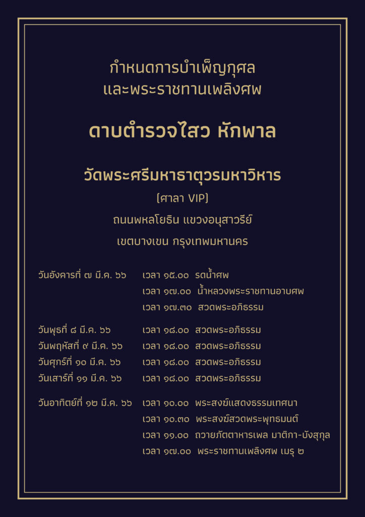 ทั้งนี้ จึงขอเรียนเชิญท่านผู้มีเกียรติทุกท่าน เข้าร่วมพิธีบำเพ็ญกุศลและพิธีพระราชทานเพลิงศพตามกำหนดการพิธีดังกล่าว โดยพร้อมเพรียงกัน