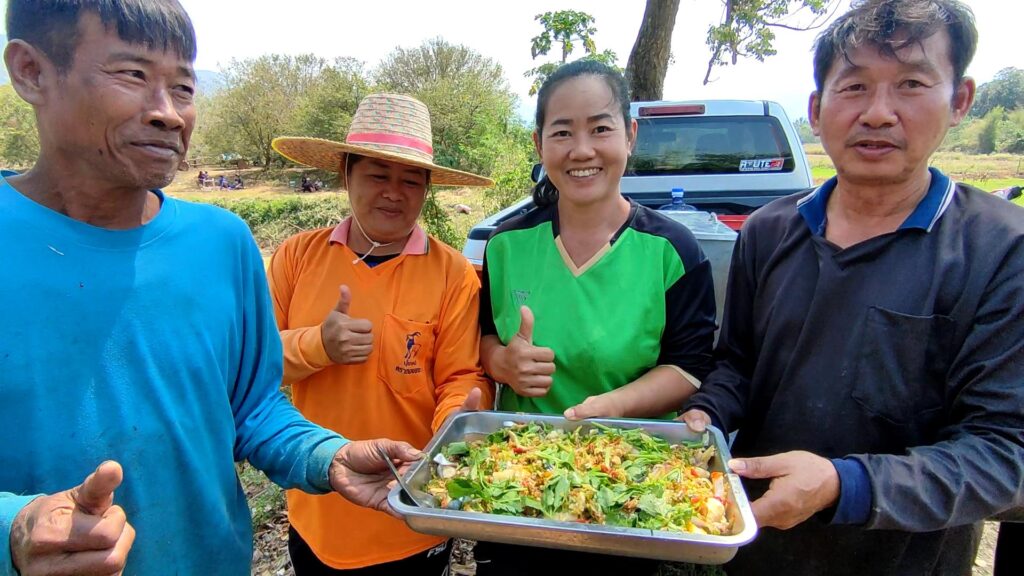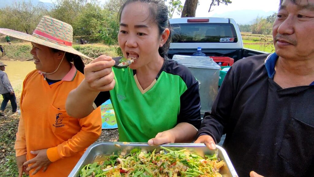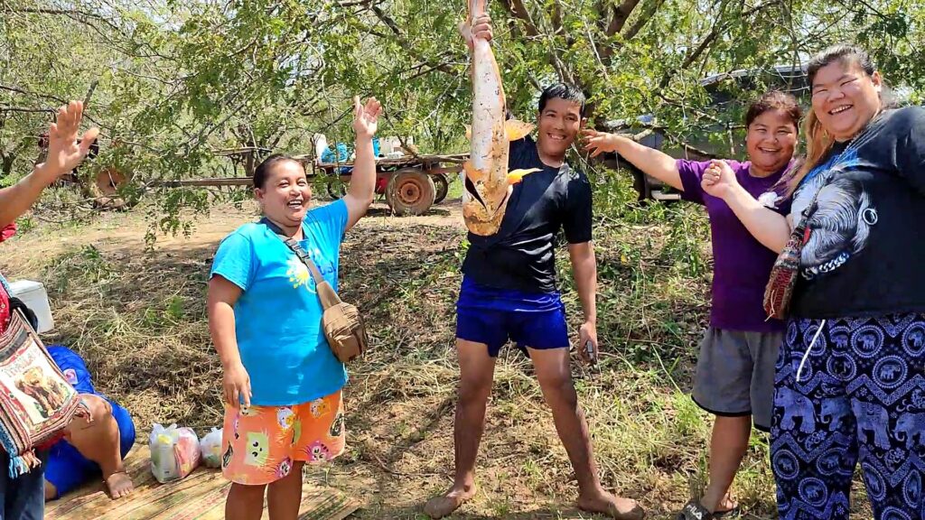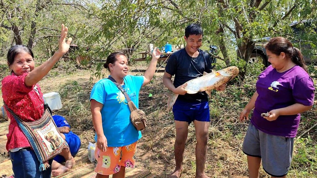 นอกจากนั้น ชาวบ้านบางคน ยังได้จัดเตรียมอุปกรณ์แคมป์ปิ้ง และเครื่องครัวติดรถมาด้วย เมื่อจับปลาได้จำนวนมาก ก็แบ่งปลาส่วนหนึ่ง มาทำเมนูเด็ด อาทิ ปลาเผา และ ลวกจิ้มปลาบึก ก่อนล้อมวง นั่งรับประทานกันสดๆ อย่างเอร็ดอร่อยเลยทีเดียว