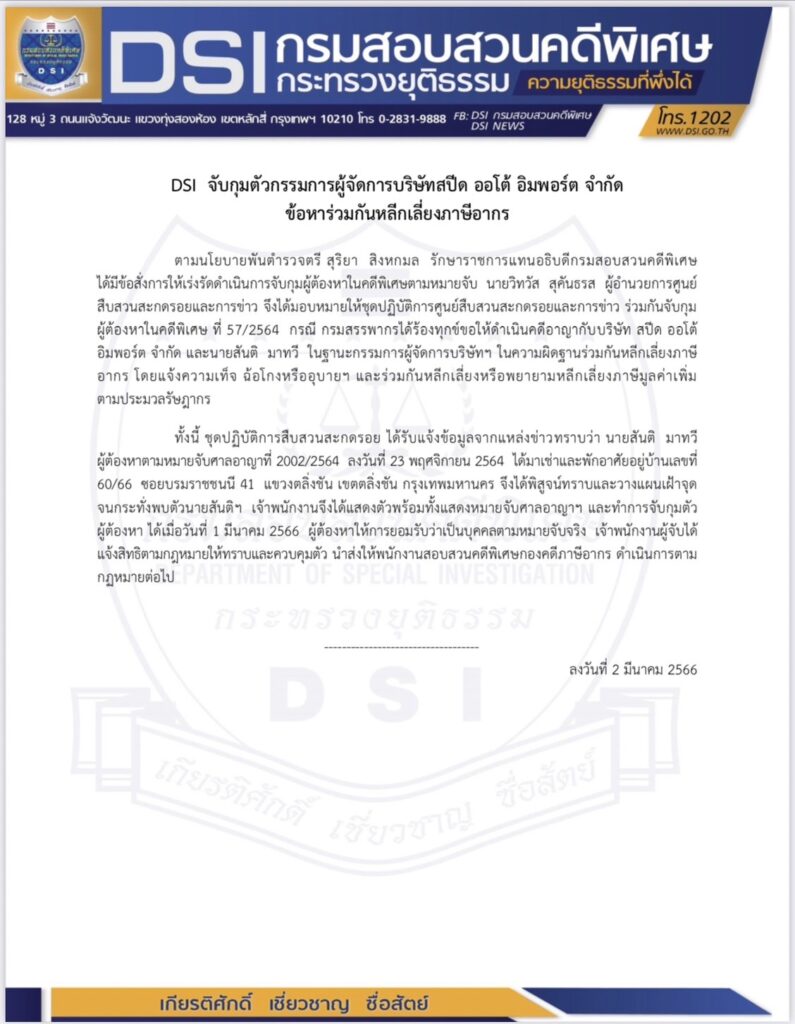 ทั้งนี้ ชุดปฏิบัติการสืบสวนสะกดรอย ได้รับแจ้งข้อมูลจากแหล่งข่าวทราบว่า นายสันติ มาทวี ผู้ต้องหาตามหมายจับศาลอาญาที่ 2002/2564 ลงวันที่ 23 พฤศจิกายน 2564 ได้มาเช่าและพักอาศัยอยู่บ้านเลขที่ 60/66 ซอยบรมราชชนนี 41 แขวงตลิ่งชัน เขตตลิ่งชัน กรุงเทพมหานคร จึงได้พิสูจน์ทราบและวางแผนเฝ้าจุดจนกระทั่งพบตัวนายสันติฯ เจ้าพนักงานจึงได้แสดงตัวพร้อมทั้งแสดงหมายจับศาลอาญาฯ และทำการจับกุมตัวผู้ต้องหา ได้เมื่อวันที่ 1 มีนาคม 2566 ผู้ต้องหาให้การยอมรับว่าเป็นบุคคลตามหมายจับจริง เจ้าพนักงานผู้จับได้แจ้งสิทธิตามกฎหมายให้ทราบและควบคุมตัว นำส่งให้พนักงานสอบสวนคดีพิเศษกองคดีภาษีอากร ดำเนินการตามกฏหมายต่อไป